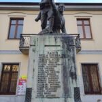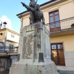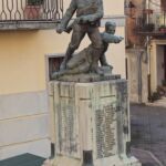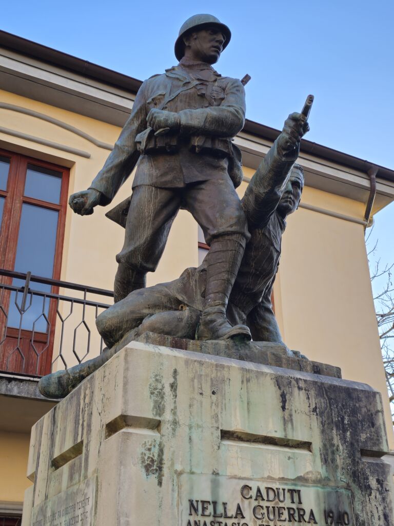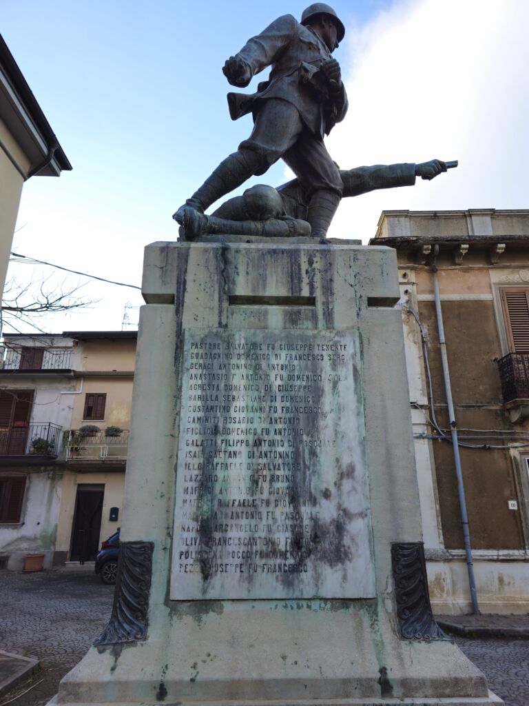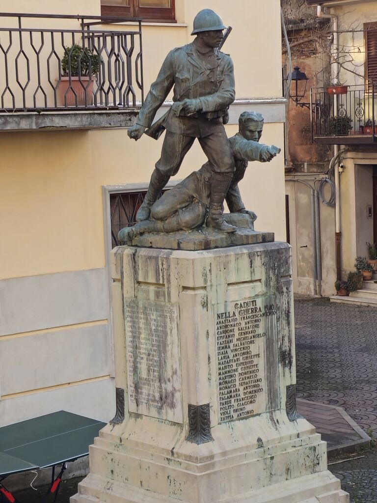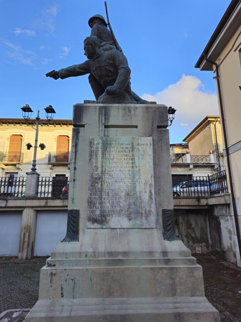 - Il monumento in muratura rivestito in marmo, sui prospetti laterali sono incisi su marmo i nomi di trentanove caduti della prima guerra mondiale e su quello frontale i nomi di venti della seconda; il gruppo scultoreo bronzeo realizzato con la tecnica di fusione.