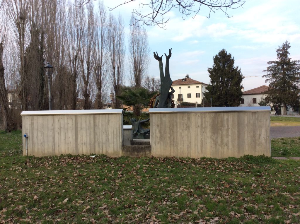 - Muretti in cemento armato ricoperti da un tettuccio in acciaio inox, scultura in bronzo, lastre commemorative in marmo bianco.