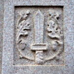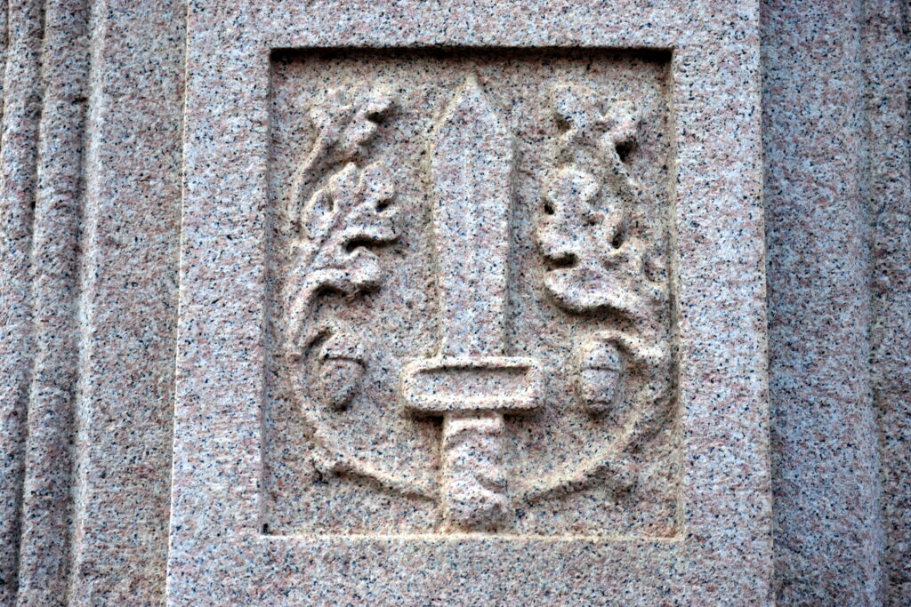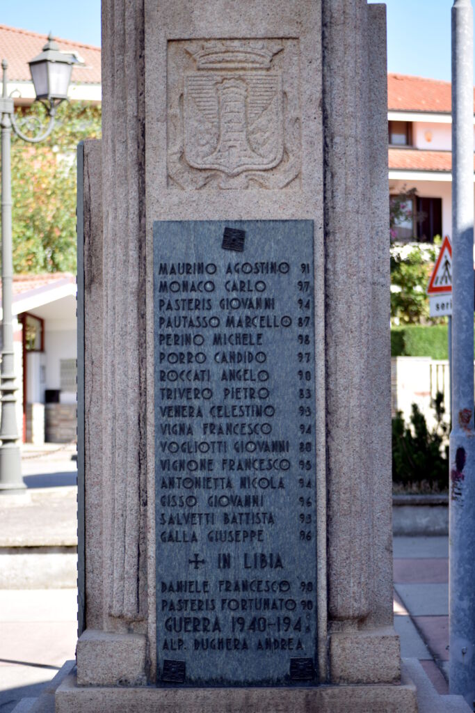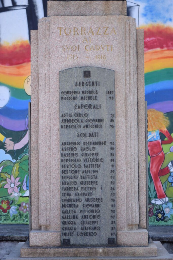 - Su tre lati del basamento sono scolpiti nella pietra i seguenti simboli: lo stemma del comune di Torrazza Piemonte; il simbolo rotondo dell'Associazione Nazionale Combattenti e Reduci; un gladio circondato da due fronde di quercia.