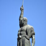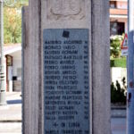 - Basamento in pietra; lastre in marmo con lettere e decori in bronzo; statua in bronzo. Ampia area di rispetto pavimentata e delimitata da catene in ferro battuto. Alle spalle del monumento è presente un murales.
