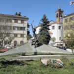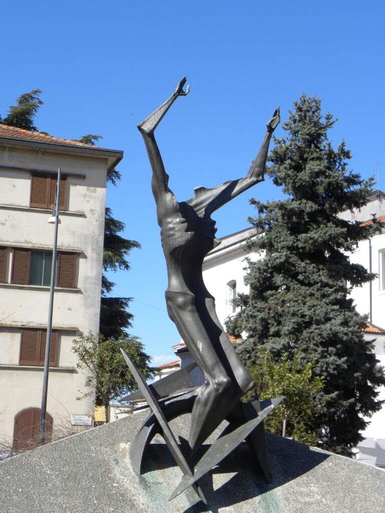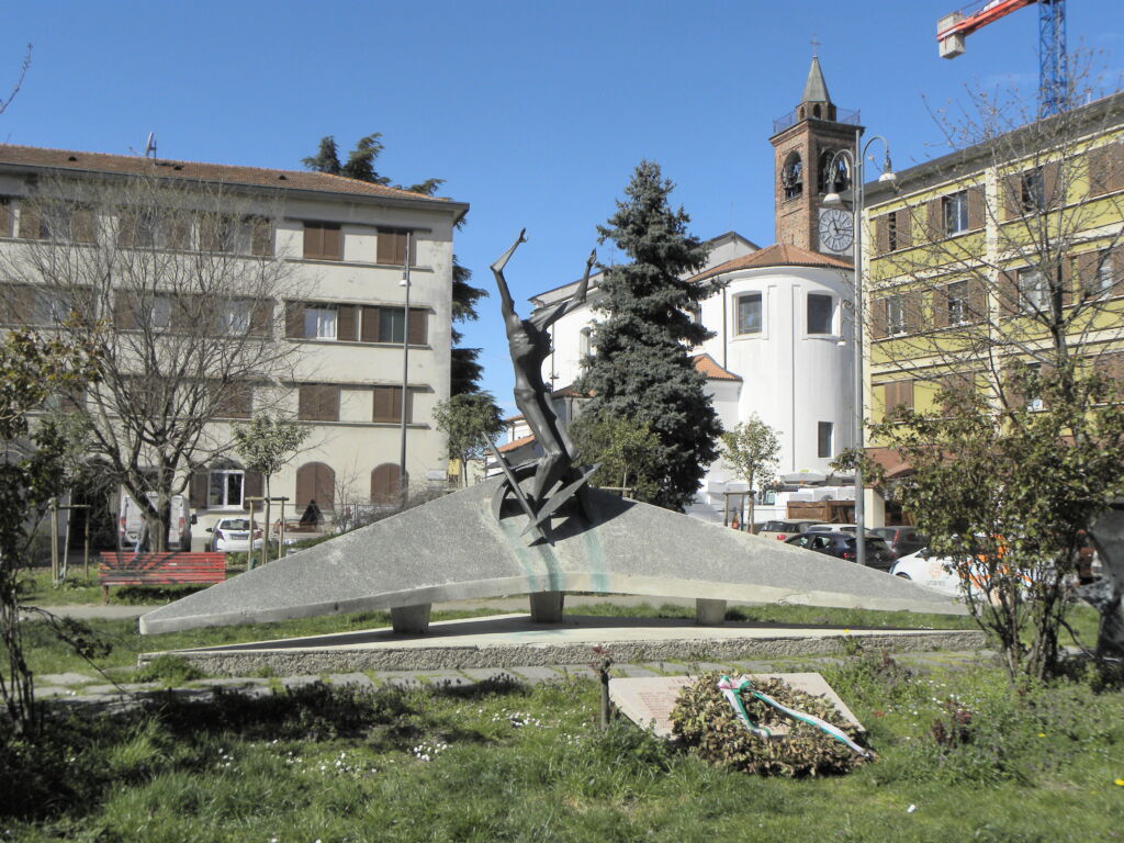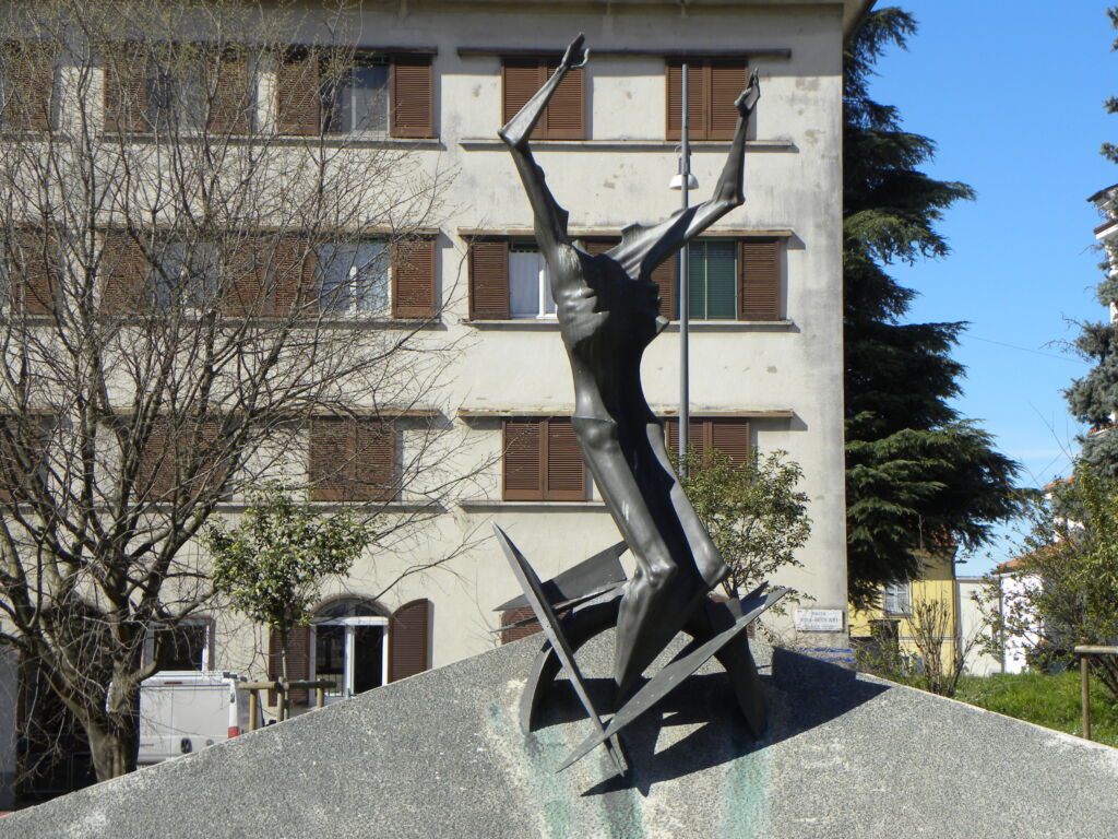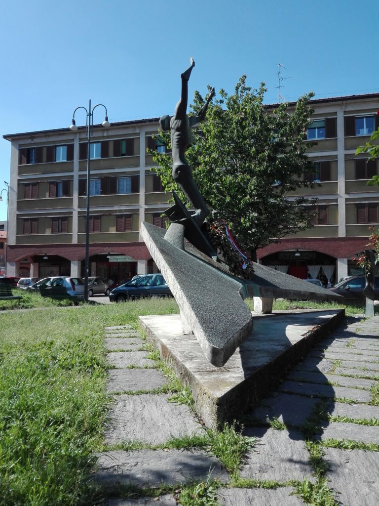 Costituito da due fusioni in bronzo; la prima, stilizzazione di un corpo umano, è posta al centro di due ‘ali’ di cemento. La seconda, una struttura astratta, si trova oltre l’estremità destra dell’insieme. Il complesso è circondato da una aiuola che copre quasi tutta la piazza. Di fronte, a terra, una lapide trapezoidale in marmo con incisi i nomi dei Caduti.