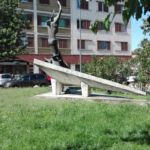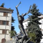 Statua in bronzo su base in cemento. Lapide di marmo.