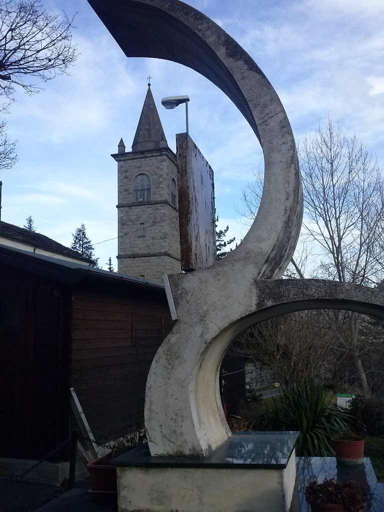 - La complessa composizione monumentale che ha come base tre parallelepipedi di cemento di dimensioni diverse ricoperte da lastre di marmo blu, sopra la struttura si alleggerisce con una scultura di cemento composta da due volute: una, più piccola, ripiegata verso il basso, l'altra si più grande si protende inclinata verso l'alto. La composizione asimmetrica presenta nella parte anteriore, corrispondente allo snodo delle volute, una lastra di marmo bianco con iscrizione della dedica sormontata da un riquadro con un alto rilievo in bronzo del profilo di una donna-madonna sofferente.