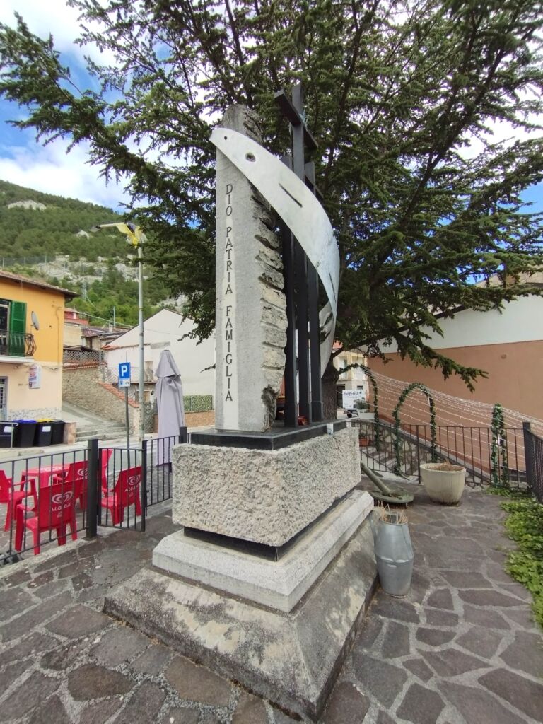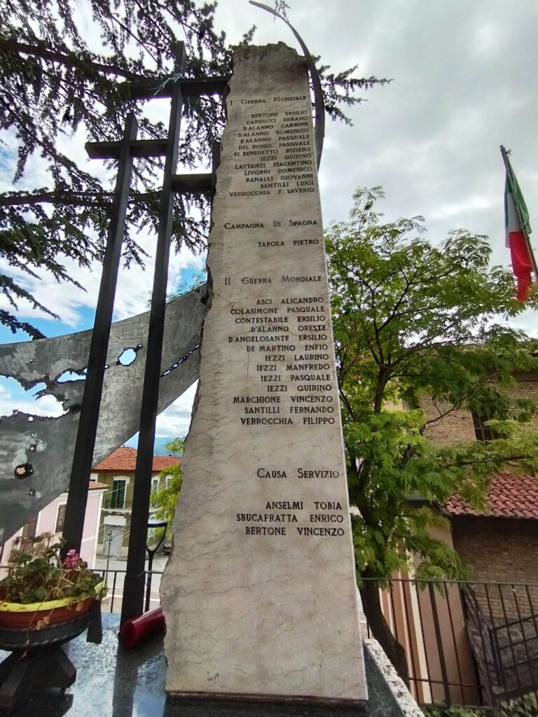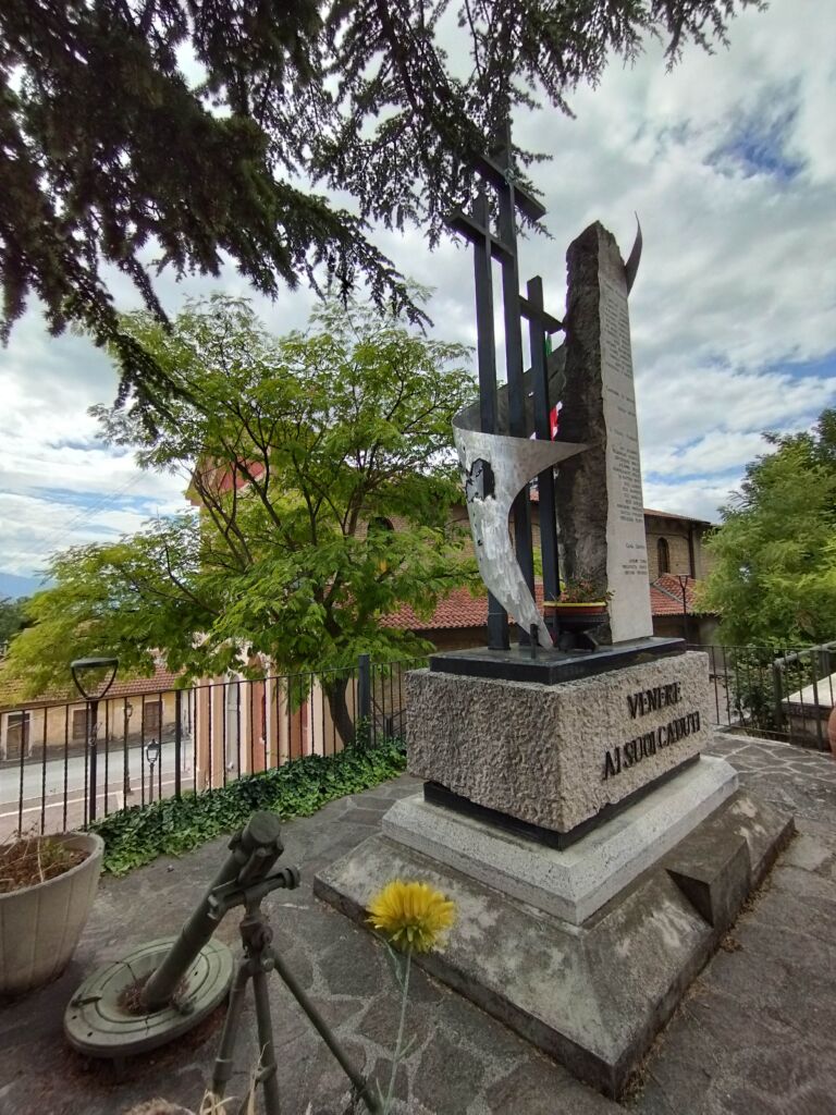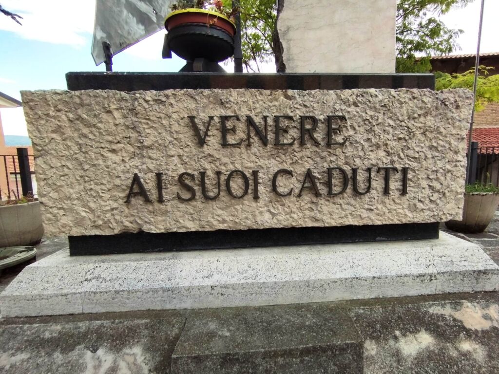 - sul lato destro una stele in marmo chiaro, rastremata lungo il lato sinistro; sul suo fronte sono incisi i nomi dei caduti, mentre sul suo lato corto è inserita un’epigrafe a caratteri maiuscoli in bronzo.