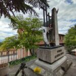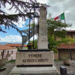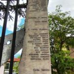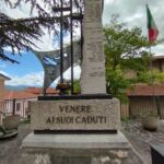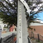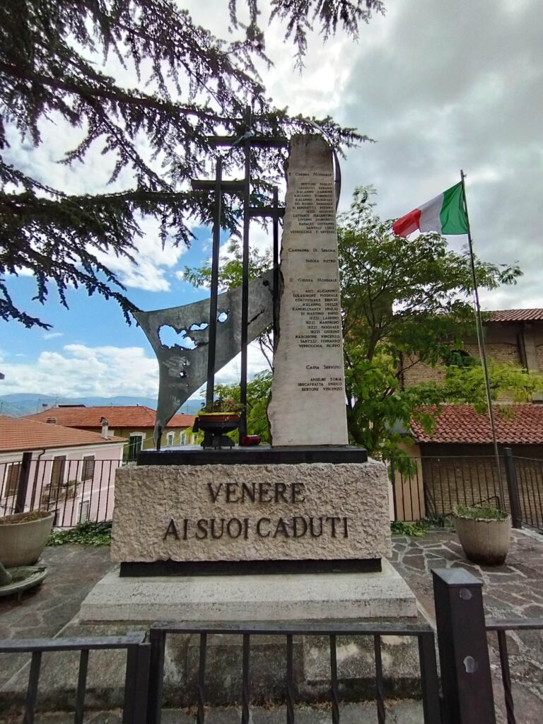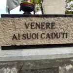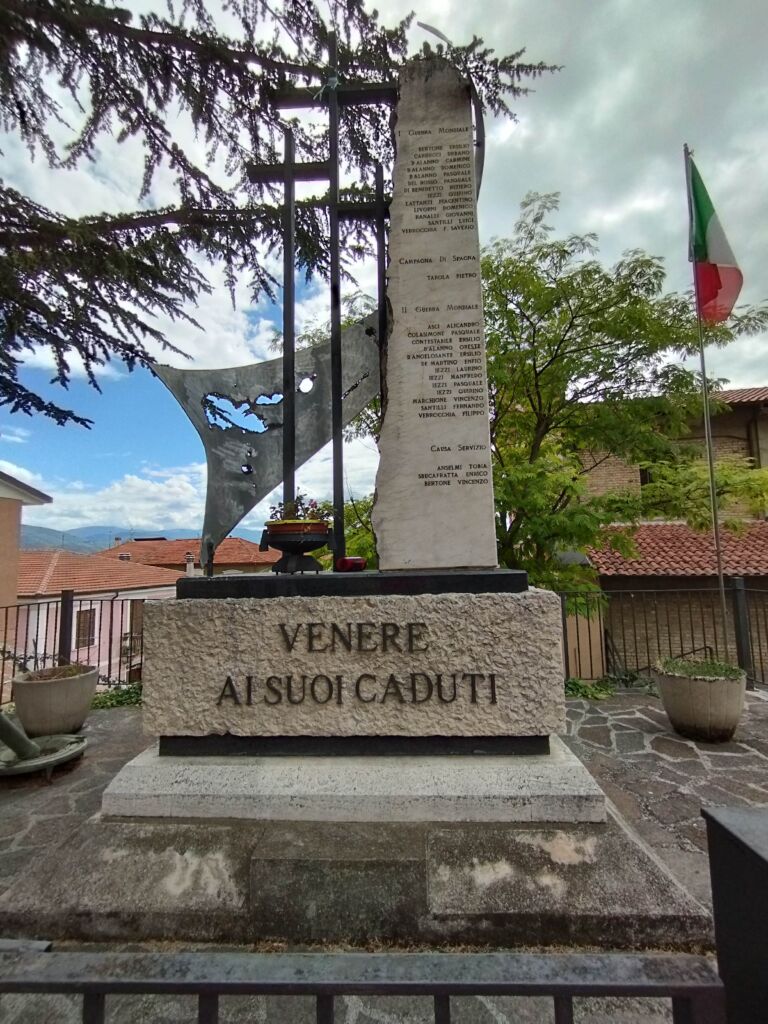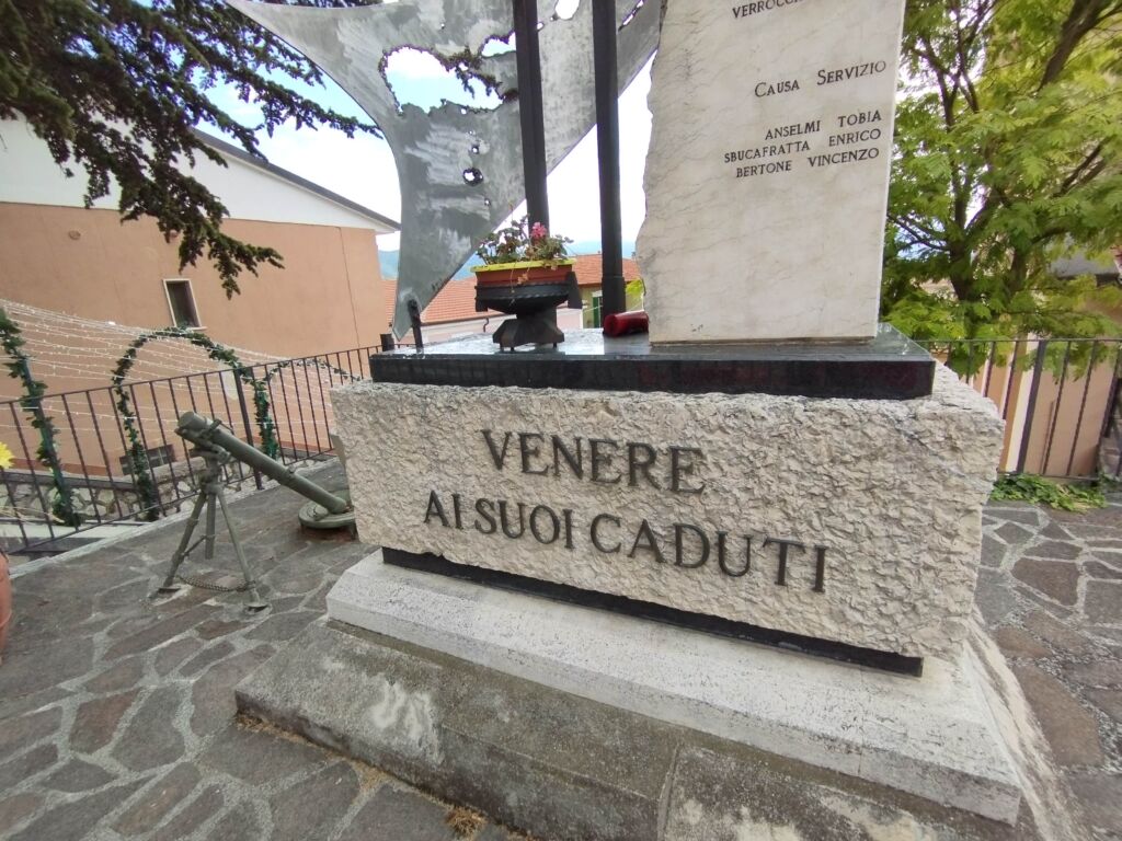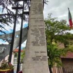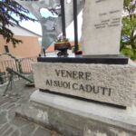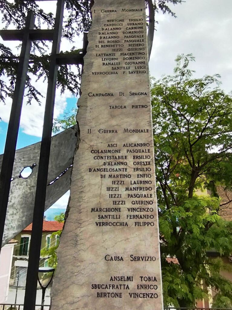 - sul lato destro una stele in marmo chiaro, rastremata lungo il lato sinistro; sul suo fronte sono incisi i nomi dei caduti, mentre sul suo lato corto è inserita un’epigrafe a caratteri maiuscoli in bronzo.