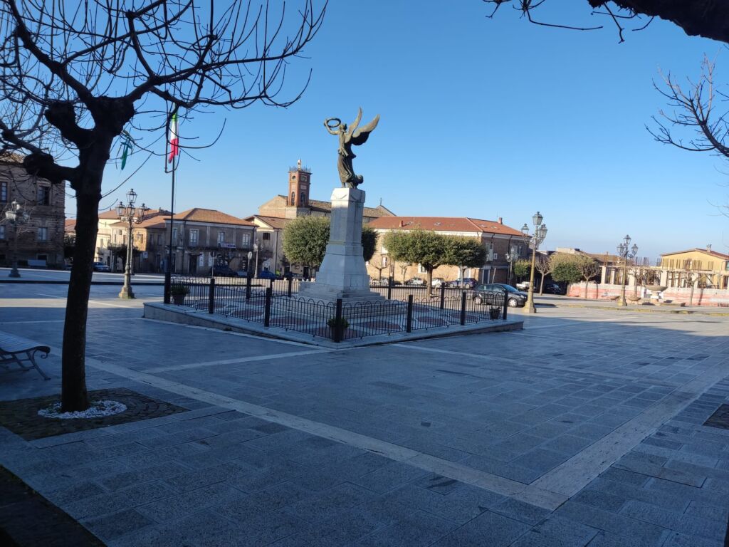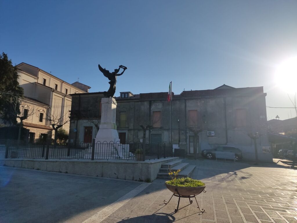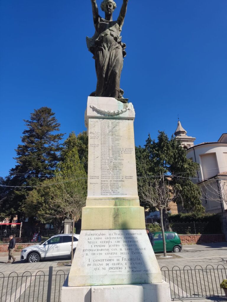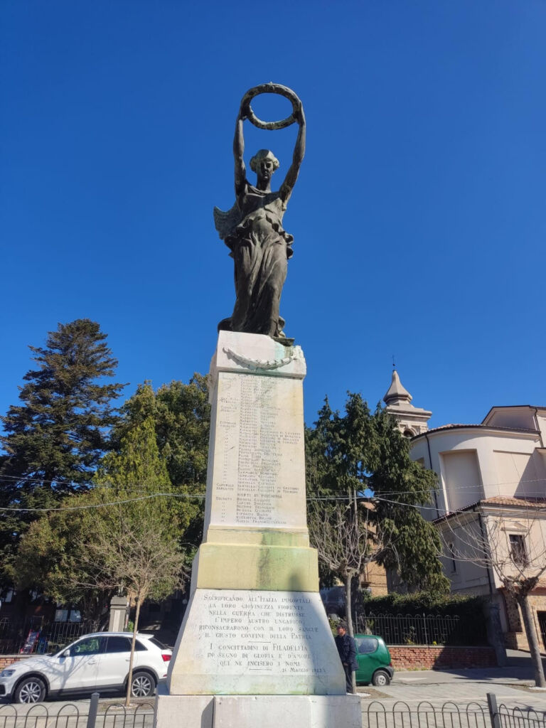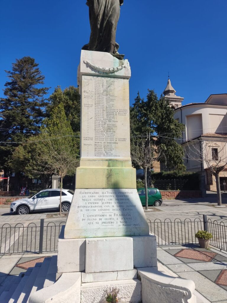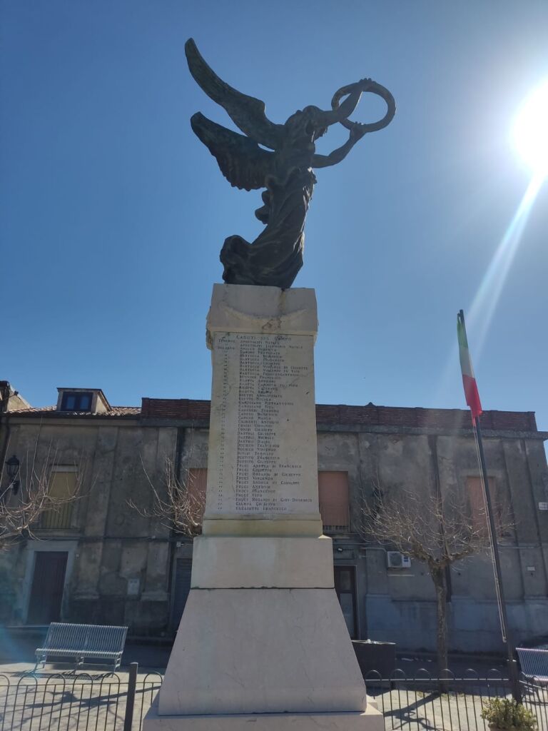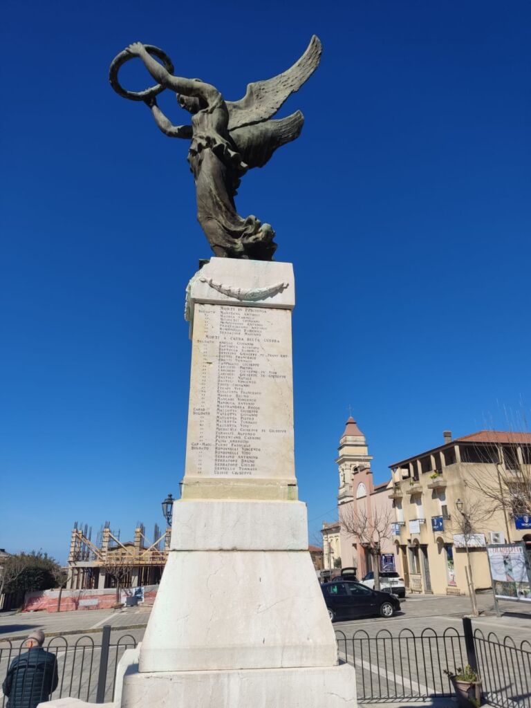 - All'epoca si formò un comitato per la costruzione del Monumento ai caduti e l'iniziativa della costituzione del comitato partì dal Regio commissario dott. Alberto Guglielmi (fratello dell'attore del cinema Rodolfo Valentino), il quale inviò fin dal novembre 1918, a tutti i notabili del paese, una lettera circolare. (Dagli atti municipali del 1918, in ASP). La società operaia diede un notevole contributo in modo fattivo e diretto alla realizzazione del monumento ai caduti. Il comitato, composto in maggioranza da ex combattenti, portò egregiamente a compimento il progetto. Dopo quasi quattro anni di preparazione, si giunse all'inaugurazione. Un notevole contributo lo aveva dato il generale Ferdinando Serrao che in quel tempo si trovava di stanza a Brescia, che era la città dove operava lo scultore. Alla cerimonia di inaugurazione, avvenuta l’11 novembre 1923, partecipò una folla di cittadini e autorità nazionali e locali.