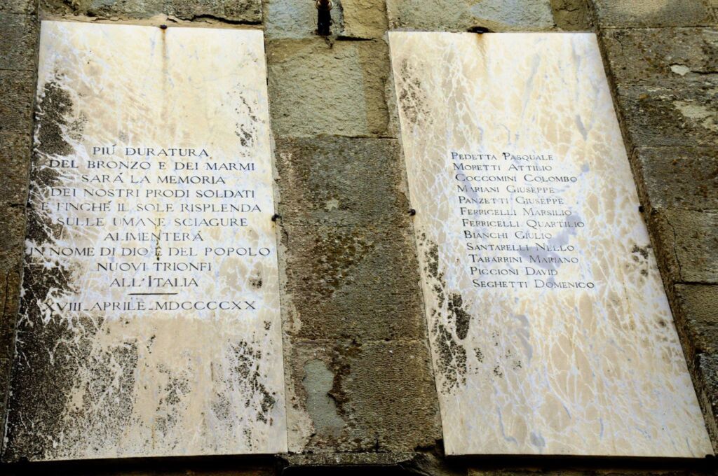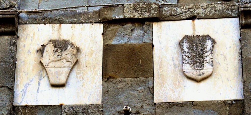 Sopra le lastre due stemmi, a sx quello di Perugia e a dx Piegaro