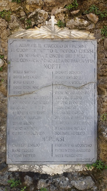 Iscrizione: "AUSPICE IL CIRCOLO DI FROSINI / IL CUORE DI TUTTO IL POPOLO ERESSE / IN MEMORIA E ONORE DEI FIGLI / CHE CONSACRARONO ALLA PATRIA LA VITA / MORTI / MORTI / BELLI SAVINO / BOGI ARTEMIO / BOGI GIULIO / BOGI GIOVANNI / BOGI NARCISO / BORGIANNI GIUSEPPE / BRANCONI CARMELO / BUCALOSSI GIULIO / BURRONI GIUSEPPE / CAPPERI NARCISO / CIGNI ELISEO / COSCI ANTONIO / COSCI INNOCENZO / DONATI REMIGIO / FANTI EMILIO / FALCHI ANGIOLINO / FALERI BERNARDINO / FIORENTINI ADOLFO / GENTILI EGIDIO / GRASSI ERCOLE / MORI EMILIO / PETRICCI CARLO / PIANIGIANI SERAFINO / PORCELLI ALIGHIERO / STACCHINI NELLO / SOLDATI ADOLFO / DISPERSI / CAPRERI EMILIO / BAGNI GIULIO / CIGNI PIETRO / FIORENTINI AGOSTINO / FIORENTINI AMEDEO / MORI PERGENTE / 1915 - 1918".