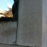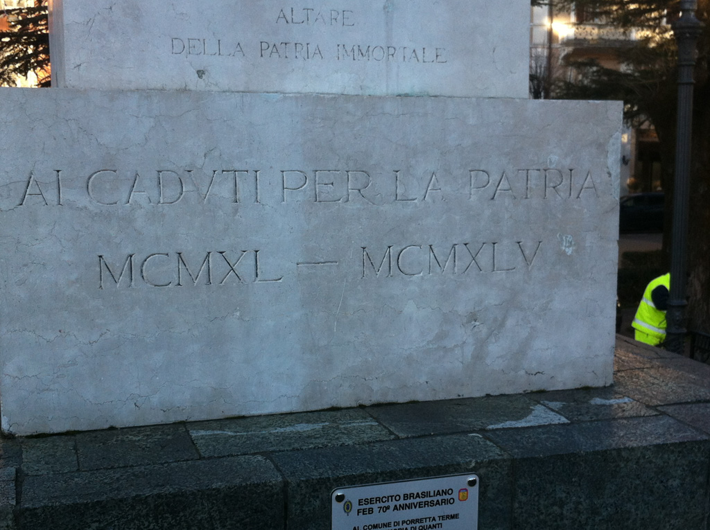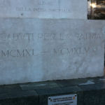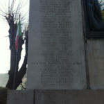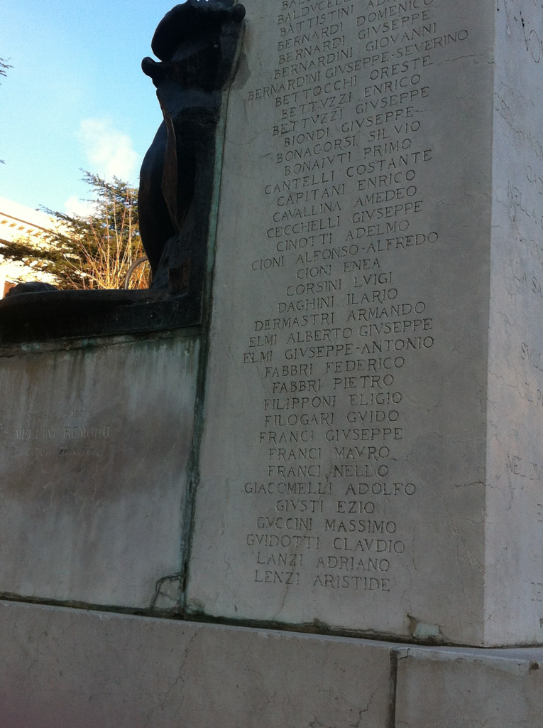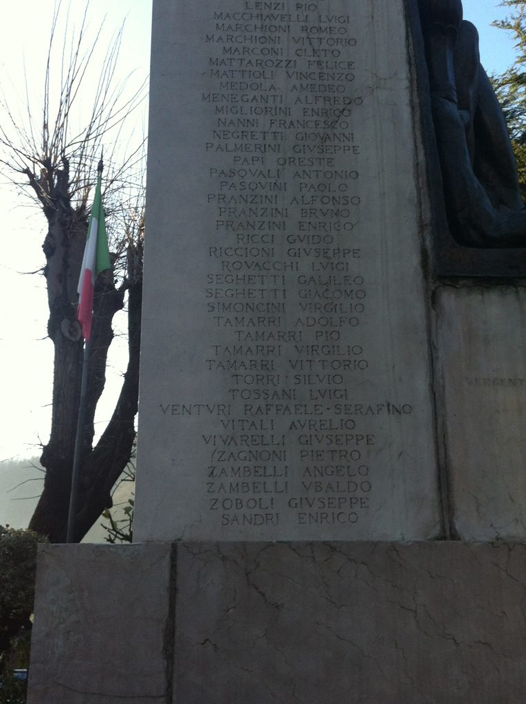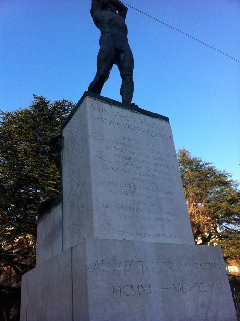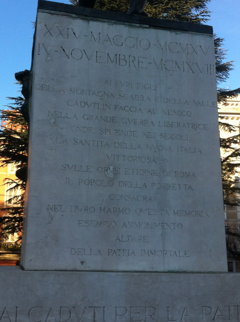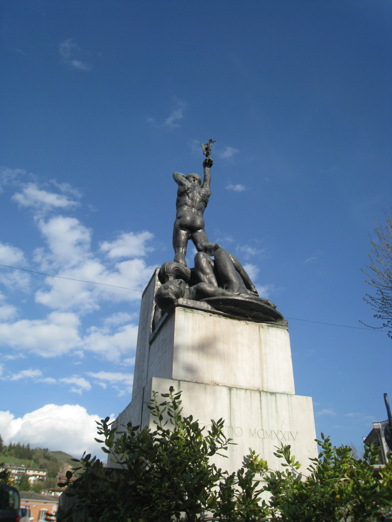 - Il Monumento si sviluppa su una base quadrata in arenaria, sul retro della quale è inserita una piccola fontana: il getto d’acqua che zampilla lento e si raccoglie in un piccolo bacino semicircolare ricorda il pianto dei superstiti per i Caduti. Sopra la base, poggiano un blocco squadrato e il piedistallo in marmo che sostiene un gruppo scultoreo in bronzo. Il memoriale è costituito da un soldato caduto, accasciato dietro un altro soldato nudo che, marciando e stringendo in pugno la vittoria alata, si slancia verso l’alto e rappresenta lo spirito di sacrificio e il senso del dovere dei soldati italiani. Il monumento fu inaugurato con solenne cerimonia il 10 agosto 1924. Nel 1940 la scultura in bronzo rischiò di essere rimossa e fusa per reperire materiale per l’industria bellica.