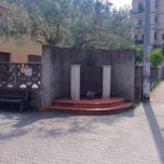 - Lastra di marmo nero lucido, colonne in marmo bianco grezzo. Basamento area dedicata e scalini in cemento ricoperto con mattonelle in cotto. Epigrafe con caratteri in bronzo. Vaso fiori in plastica. Parete "quinta" del monumento in cemento e laterizi.