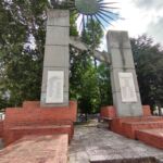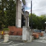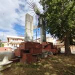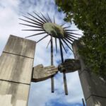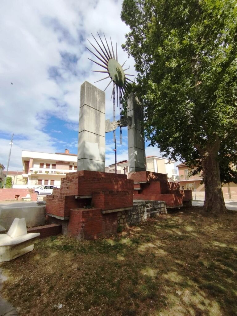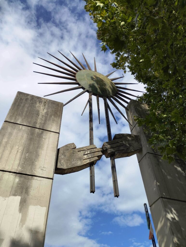 - Dai lati interni delle colonne di cemento fuoriescono due raffigurazioni di mani che si tendono in segno di pace. Da entrambi le mani si dipartono due tubi in ferro battuto che sorreggono un sole stilizzato in metallo.
