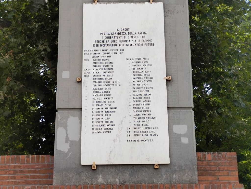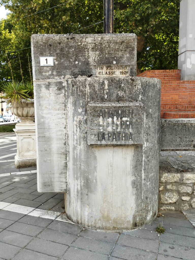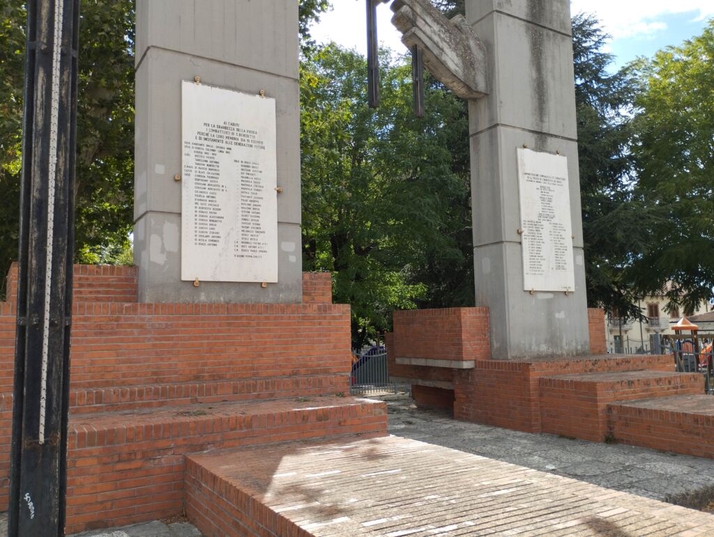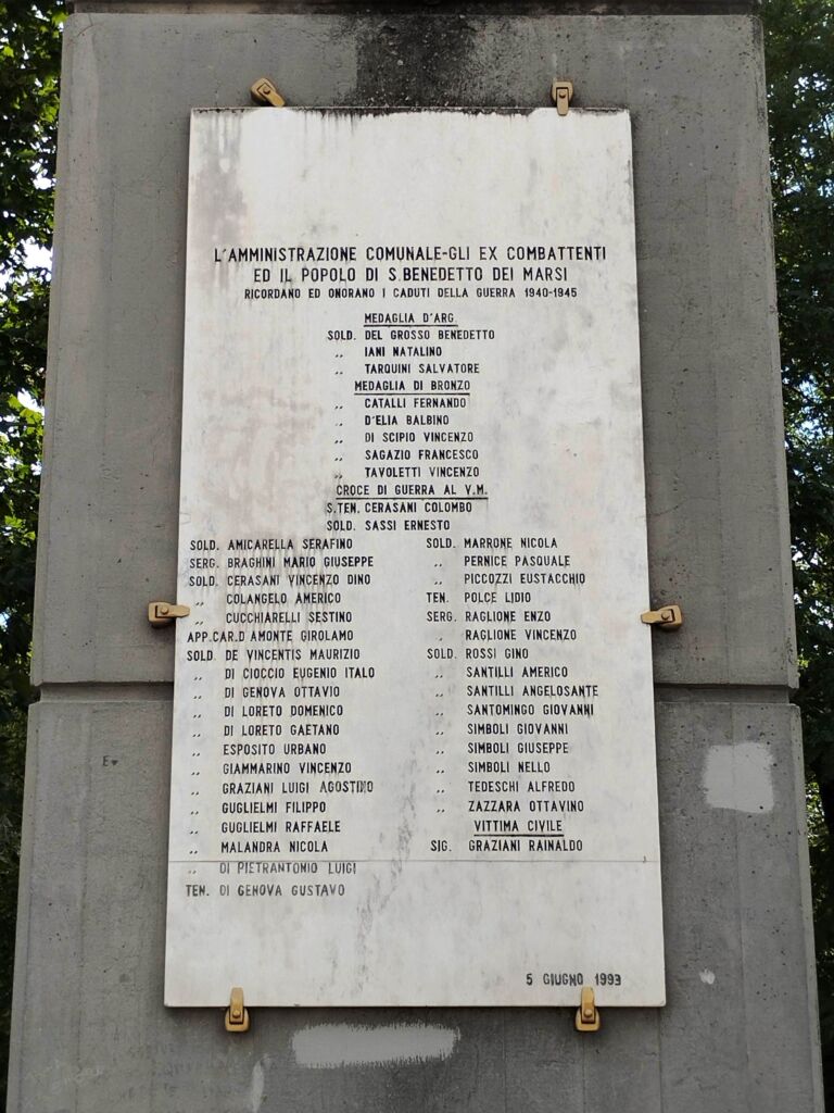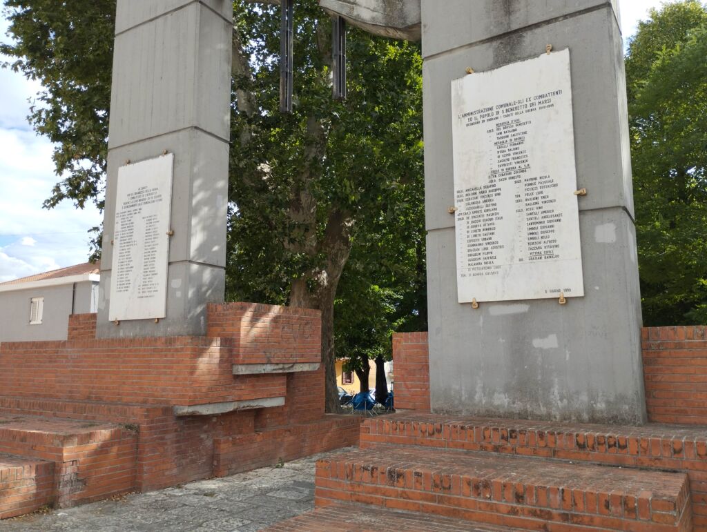 - L'iscrizione della lastra posta sulla colonna a sinistra è una riproduzione di quella presente sulla lapide posta sulla facciata della Biblioteca Comunale (pietra 288965 - Lapide ai Caduti per la grandezza della Patria - San Benedetto dei Marsi).