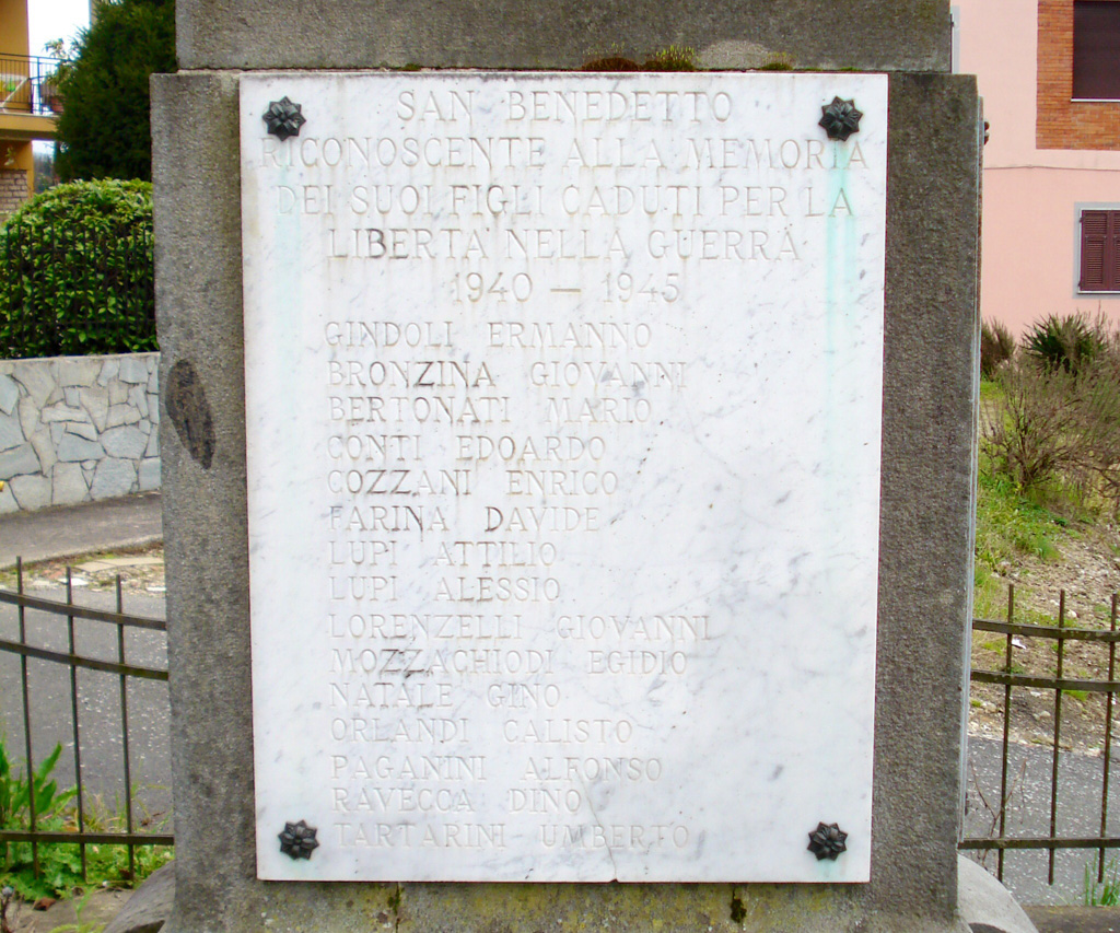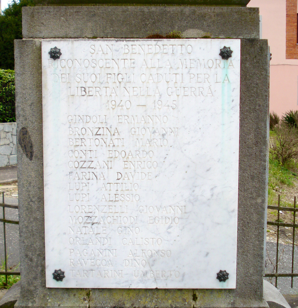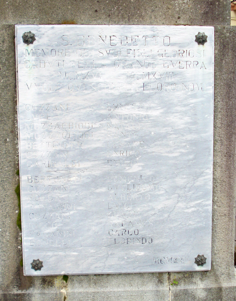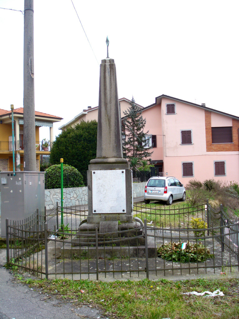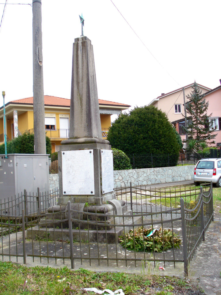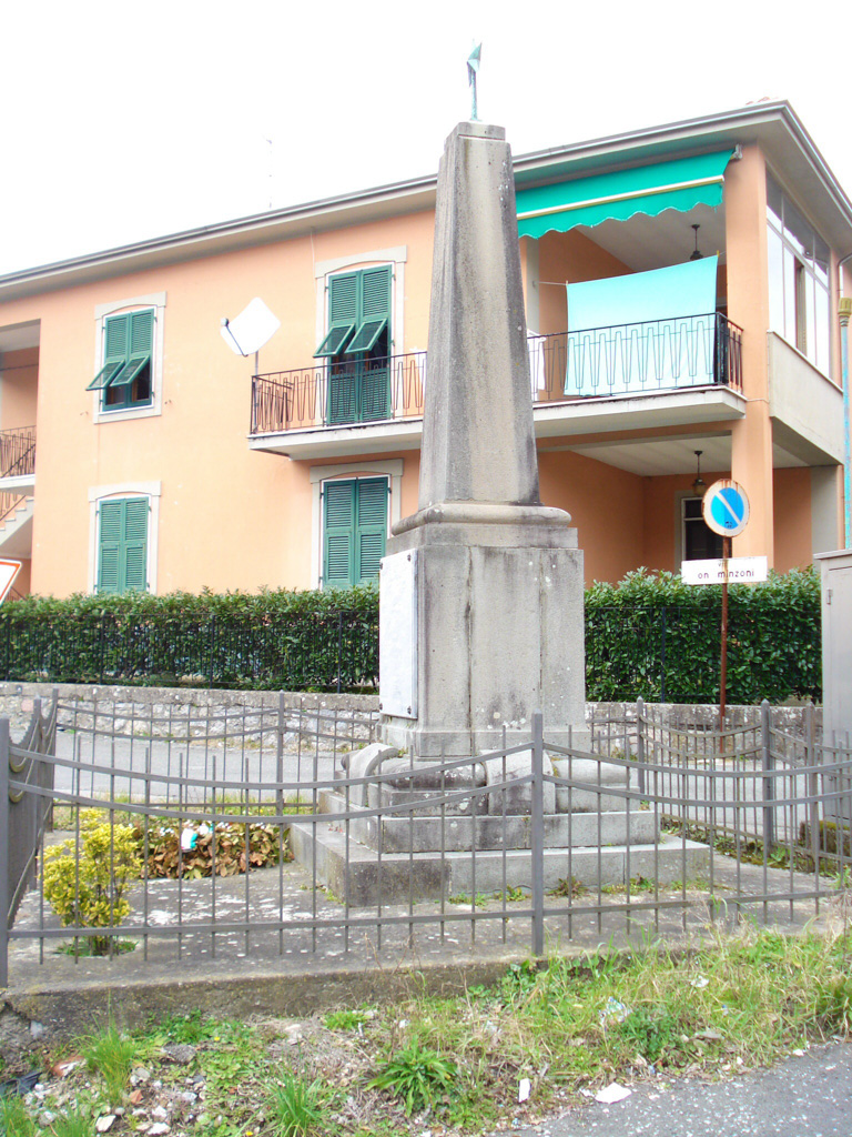 - Obelisco in cemento su basamento in cemento; lapidi in marmo bianco di Carrara; croce in bronzo.