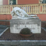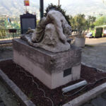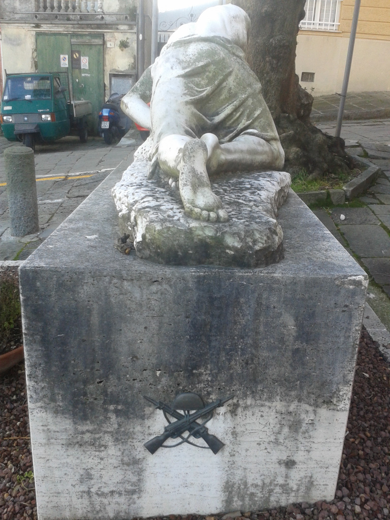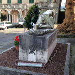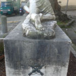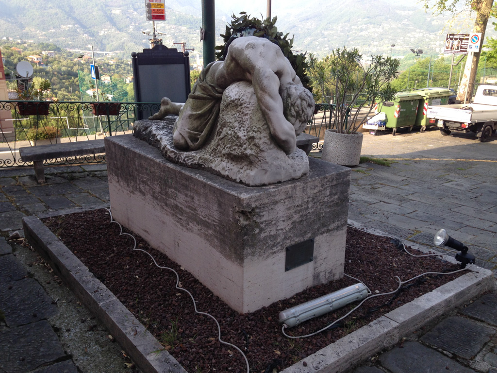 - Basamento in pietra; statua di marmo bianco; targa in metallo; decorazioni laterali in bronzo; piccola aiuola.