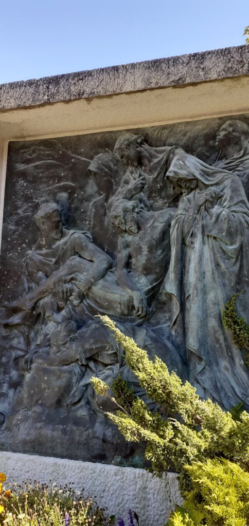 Il bassorilievo è in bronzo e raffigura la "Pietà" collocata all'interno di una cornice in marmo giallo d'Istria.