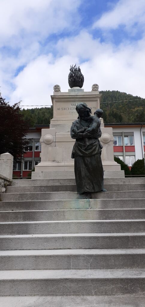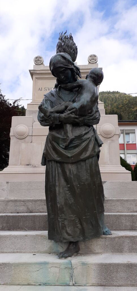 - La figura principale del monumento è la donna - madre - vedova, con il bambino in braccio, una donna del popolo, con i piedi scalzi e il fazzoletto allacciato dietro la nuca, tipico della donne cadorine anziane o vedove.