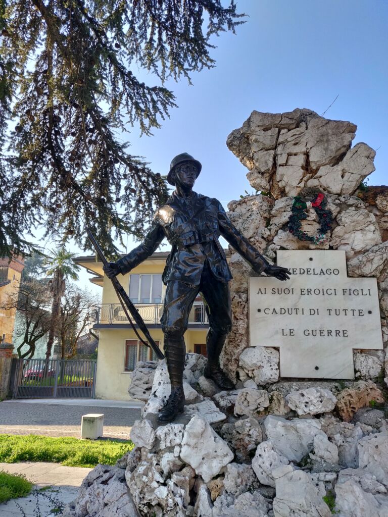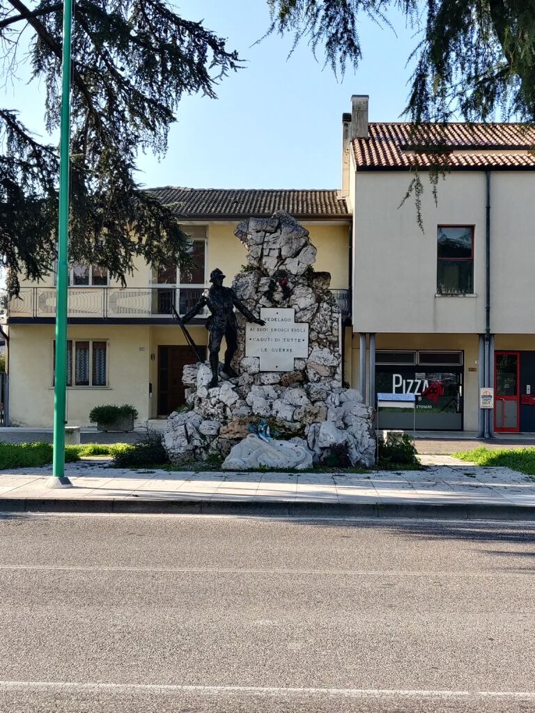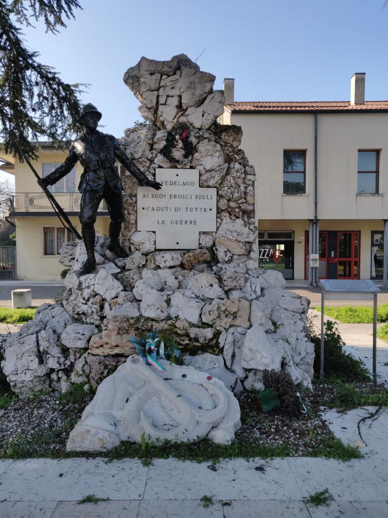 - Ai piedi del monumento è posato un bassorilievo di pietra chiara. Il bassorilievo rappresenta un salvagente, un'ancora e delle corde; sulla destra si vedono un elmetto militare e tre proiettili di grosso calibro; l'insieme riporta la dedica al piroscafo Principe Umberto, su cui erano imbarcati alcuni marinai di Vedelago, che fu affondato in combattimento nel 1916. Sulla sinistra del monumento c'è la statua in bronzo di un fante, realizzata da Egisto Caldana (Vicenza 1887-1961). Di fronte al monumento, sulla sinistra, svetta un palo metallico con la bandiera tricolore.