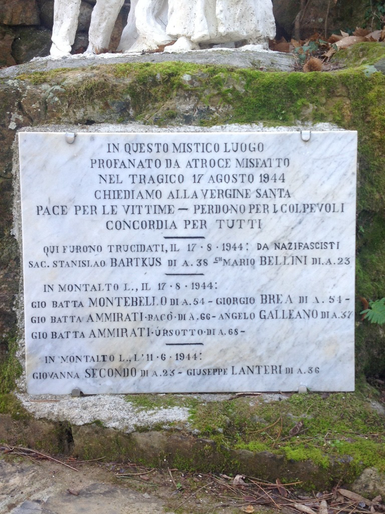 In questo mistico luogo profanato da atroce misfatto nel tragico 17 agosto 1944 chiediamo alla Vergine Santa pace per le vittime - perdono per i colpevoli - concordia per tutti