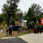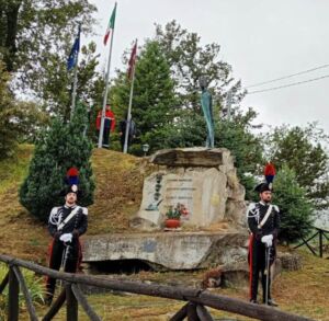 - Il monumento è costituito da un insieme di massi in pietra locale al di sopra dei quali campeggia una scultura in bronzo raffigurante il volto della Gloria, che avviluppa con il suo drappo i nomi dei Martiri e i simboli dell’Arma dei Carabinieri (granata sormontata da fiamma) e del Corpo degli Alpini.