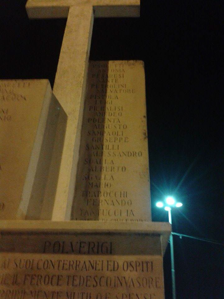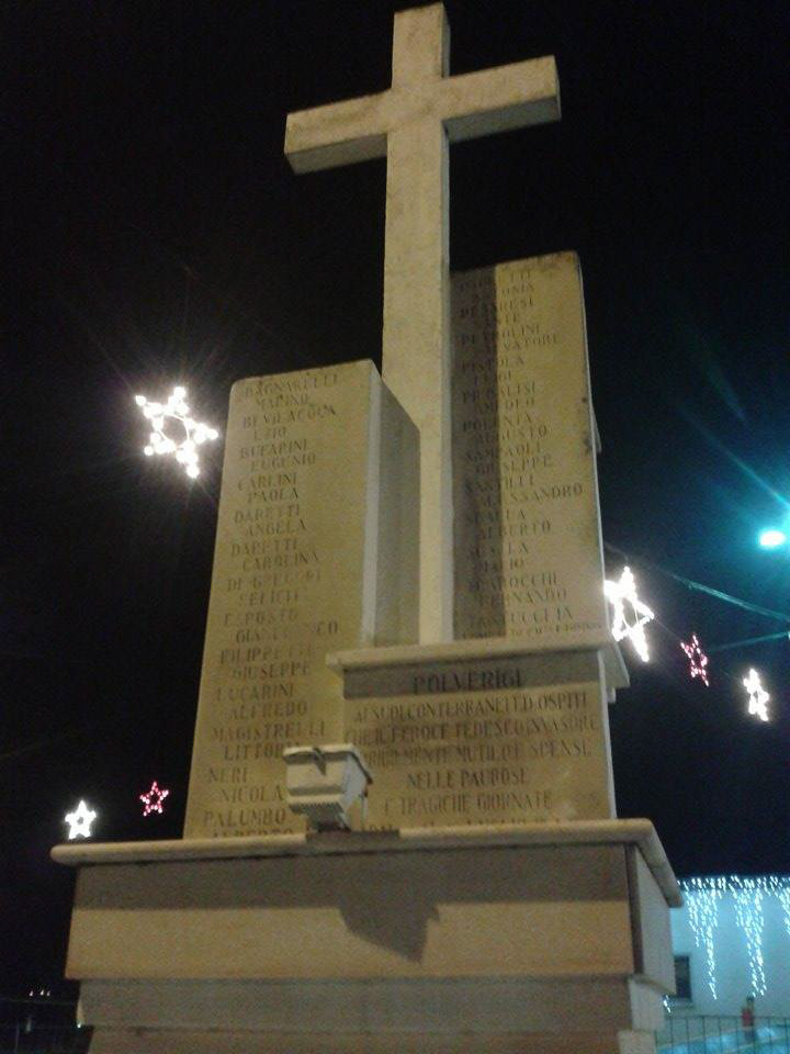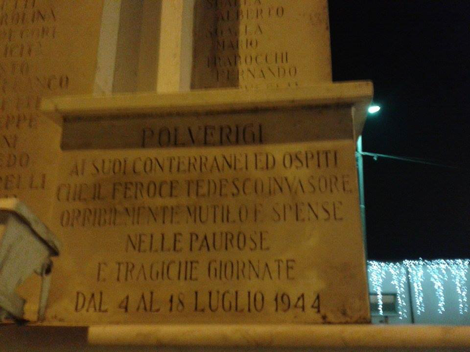 Nel 1944, e in particolar modo nel periodo che va dal 4 al 18 luglio, Polverigi viene coinvolta nella battaglia per la liberazione di Ancona, ciò provoca gravi danni al centro storico e numerosi morti i cui nomi sono riportati nel presente monumento.