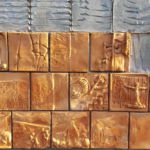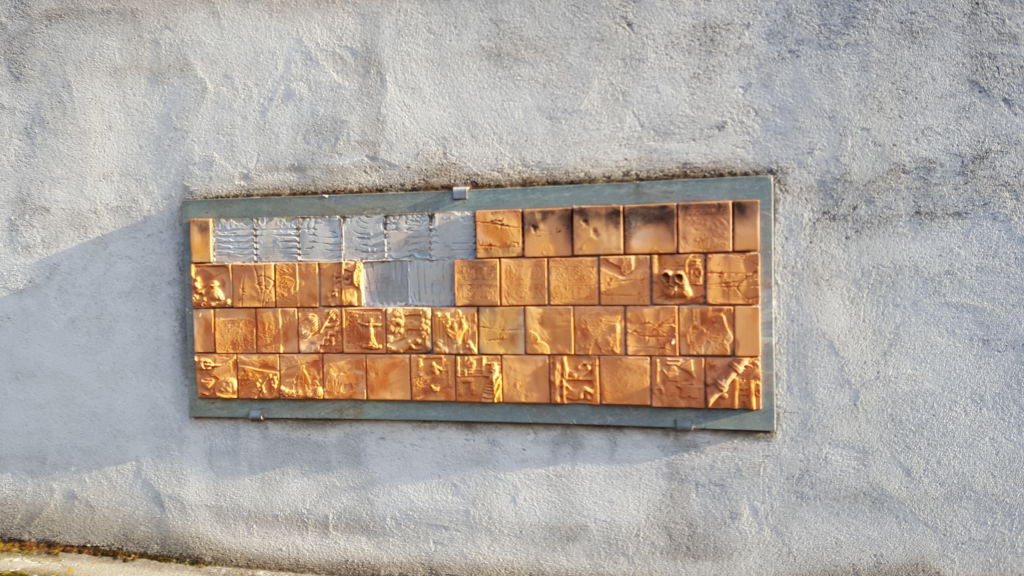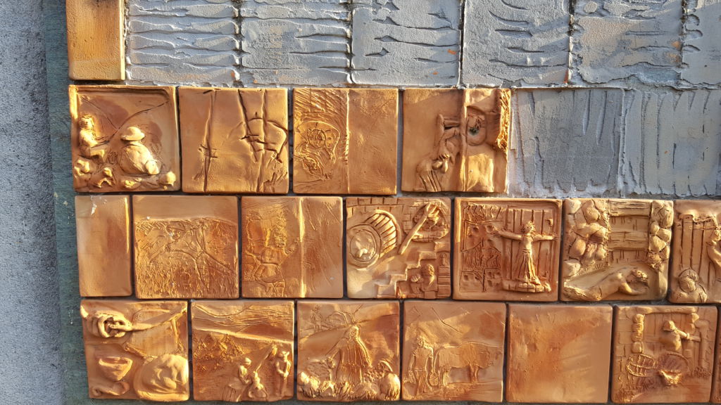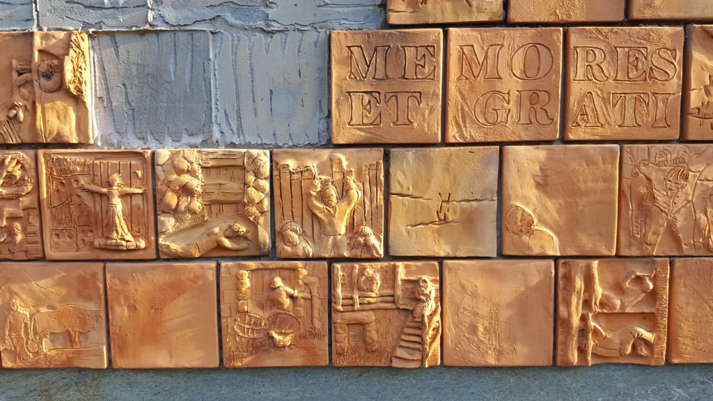 Sul muro retrostante è affissa una lastra formata da piastrelle di terracotta che illustrano scene di guerra, di ribellione contro i nazisti e prigionia; non è ben conservata poiché alcune di esse sono cadute.