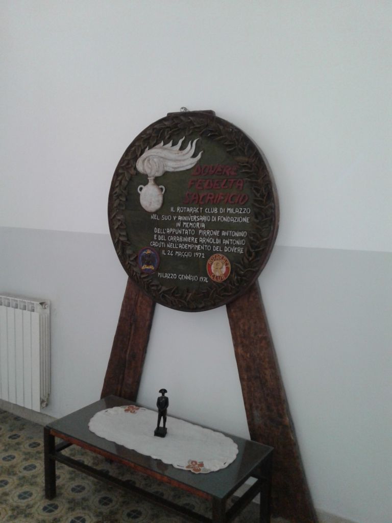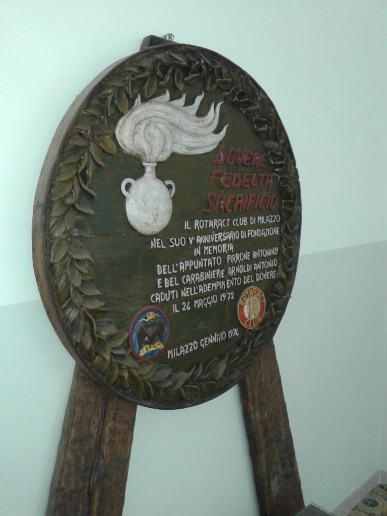 - DOVERE / FEDELTA' / SACRIFICIO / IL ROTARACT CLUB DI MILAZZO / NEL SUO V° ANNIVERSARIO DI FONDAZIONE / IN MEMORIA / DELL'APPUNTATO PIRRONE NATONIO / E DEL CARABINIERE ARNOLDI ANTONIO / CADUTI NELL'ADEMPIMENTO DEL DOVERE / IL 24 MAGGIO 1972 / MILAZZO GENNAIO 1974