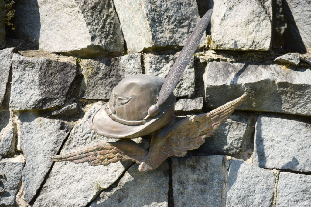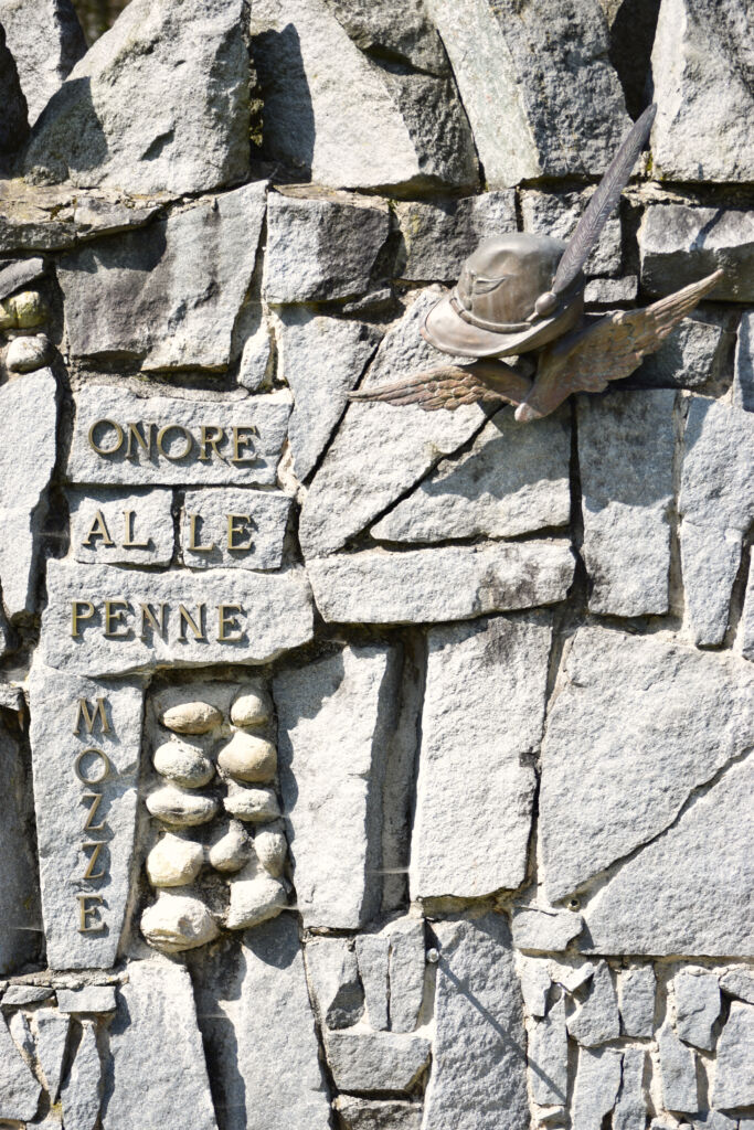 - Sopra un'aquila ad ali spiegate è posto il Cappello degli Alpini con la lunga penna.