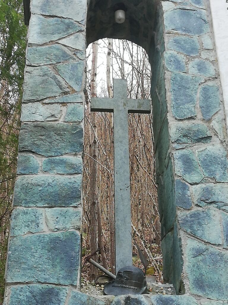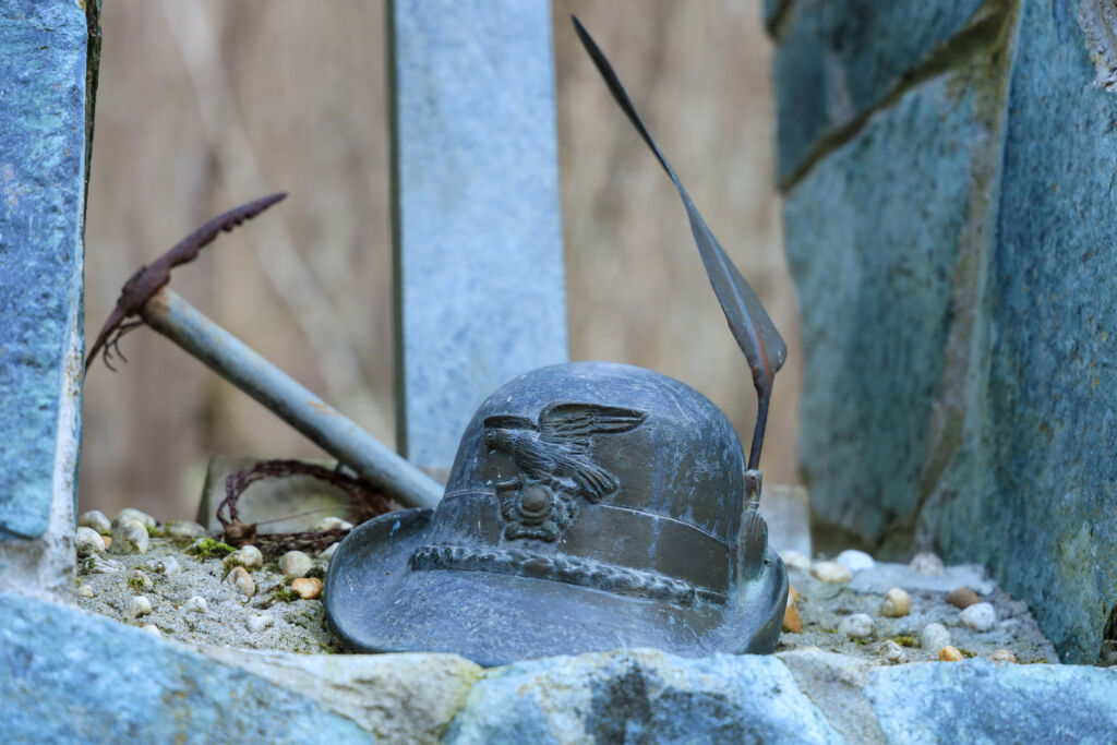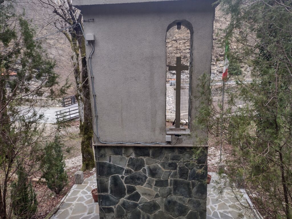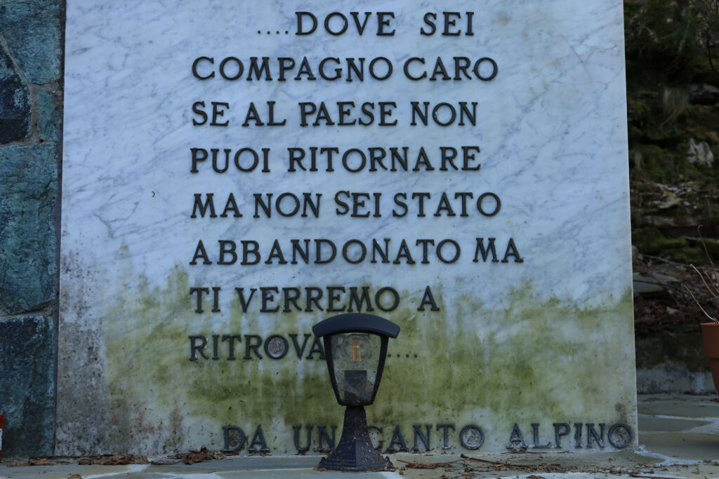 - Sono presenti in una nicchia all'interno del monumento: una croce in metallo, una scultura raffigurante un cappello alpino in metallo e una piccozza in legno e metallo. Alla base del monumento è presente una lanterna in metallo e vetro.