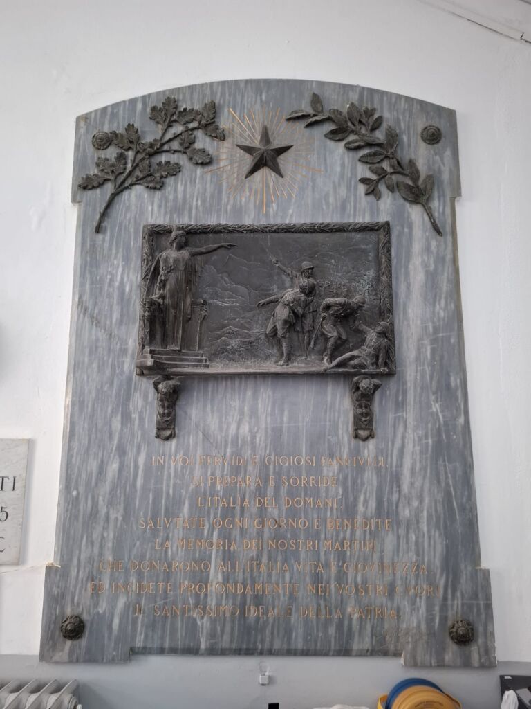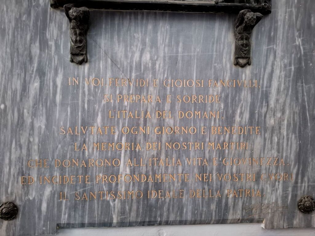 A destra sotto l’iscrizione è incisa una firma (Alfredo Gannone?): non è noto se autore della scultura bronzea o della dedica.