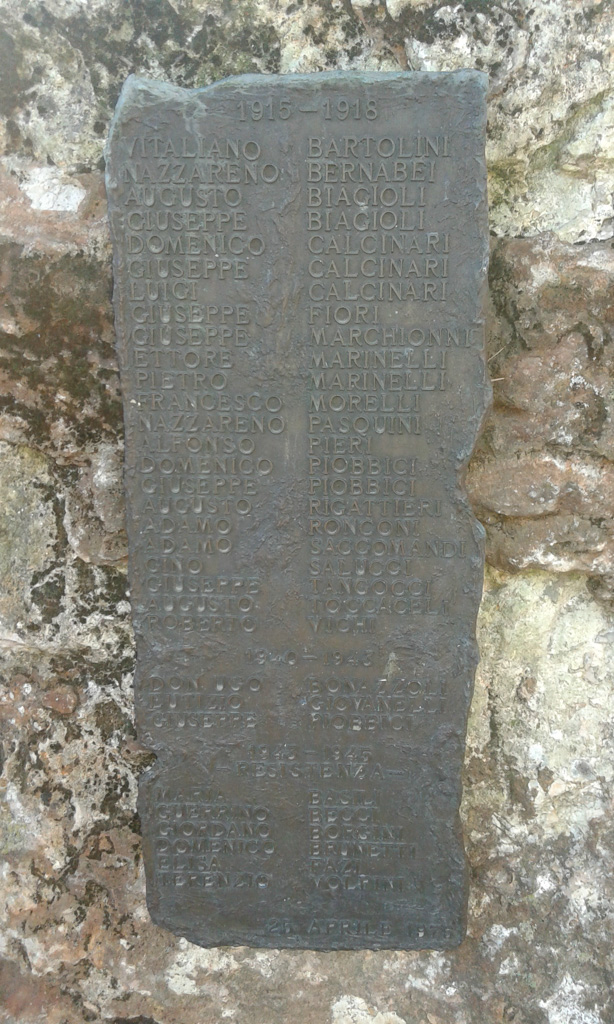 1915 – 1918 / VITALIANO BARTOLINI / NAZZARENO BERNABEI / AUGUSTO BIAGIOLI / GIUSEPPE BIAGIOLI / DOMENICO CALCINARI / GIUSEPPE CALCINARI / LUIGI CALCINARI / GIUSEPPE FIORI / GIUSEPPE MARCHIONNI / ETTORE MARINELLI / PIETRO MARINELLI / FRANCESCO MORELLI / NAZZARENO PASQUINI / ALFONSO PIERI / DOMENICO PIOBBICI / GIUSEPPE PIOBBICI / AUGUSTO RIGATTIERI / ADAMO RONCONI / ADAMO SACCOMANDI / GINO SALUCCI / GIUSEPPE TANGOCCI / AUGUSTO TOCCACELLI / ROBERTO VICHI.
