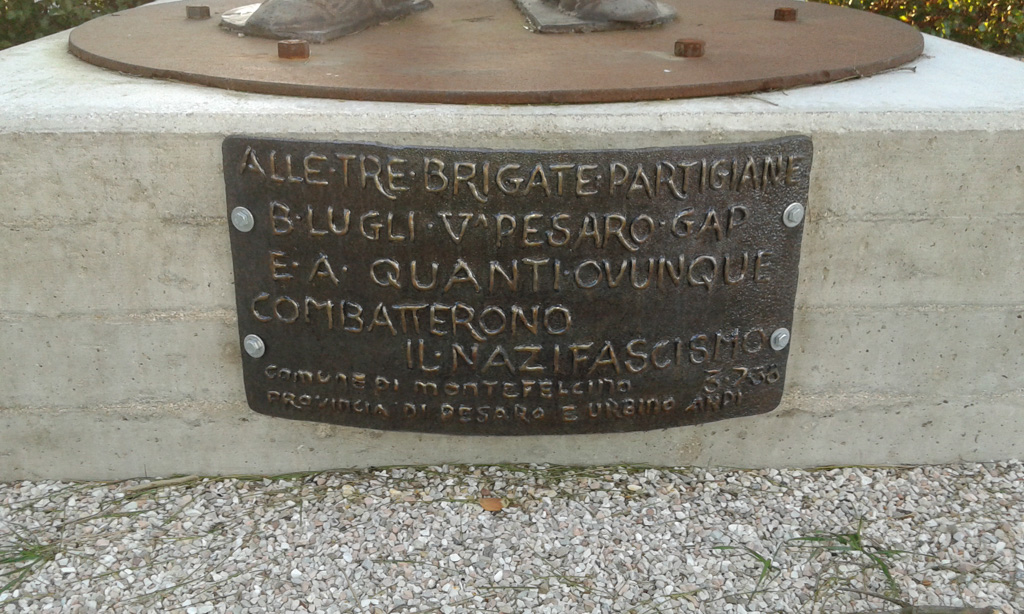 ALLE BRIGATE PARTIGIANE / B. LUGLI. – V PESARO – G.A.P./ E A QUANTI OVUNQUE COMBATTERONO / IL NAZIFASCISMO” / COMUNE DI MONTEFELCINO – 3 LUGLIO 1988 / PROVINCIA DI PESARO E URBINO – A.N.P.I.