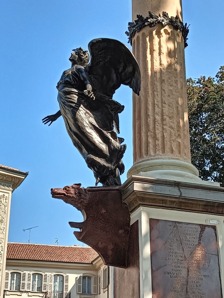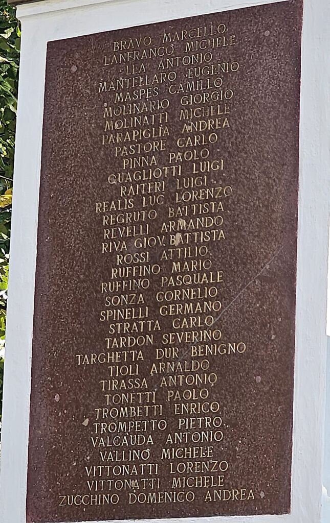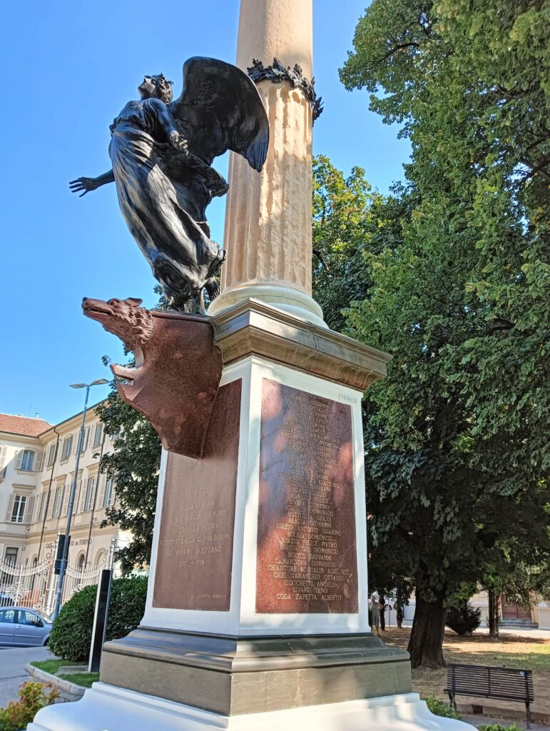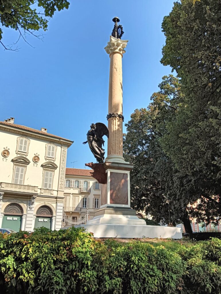 Colonna con capitello corinzio, alta circa 10 metri, attribuita allo scultore Piero Canonica (Moncalieri 1869, Roma 1959) e composta di vari tipi di pietra e marmo (colonna e capitello in marmo bianco, base e cimasa del piedistallo in marmo verde, lastre commemorative in marmo rosso, basamento bianco). Si trova nel mezzo del Parco della Rimembranza, al centro di un’aiuola rotonda leggermente rialzata e delimitata da siepi di arbusti.