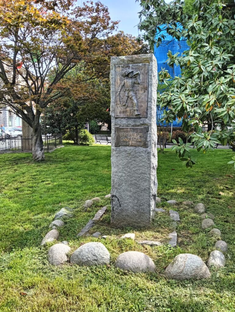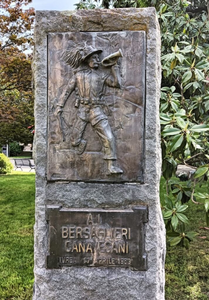 Questo cippo è dedicato ai Bersaglieri Canavesani caduti in guerra, ed è stato posizionato nel Parco di Ivrea il 17 aprile 1983, in concomitanza della costituzione del 6° Reggimento Bersaglieri (il 16 aprile 1861, a Capua venne costituito il 6° Corpo d’Armata, rinominato otto mesi dopo 6° Reggimento Bersaglieri, oggi inquadrato nella Brigata Aosta).