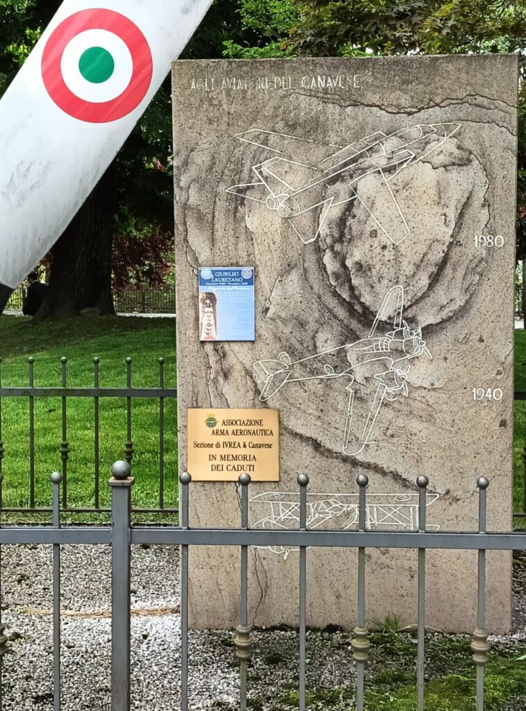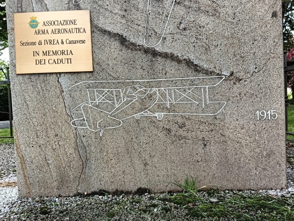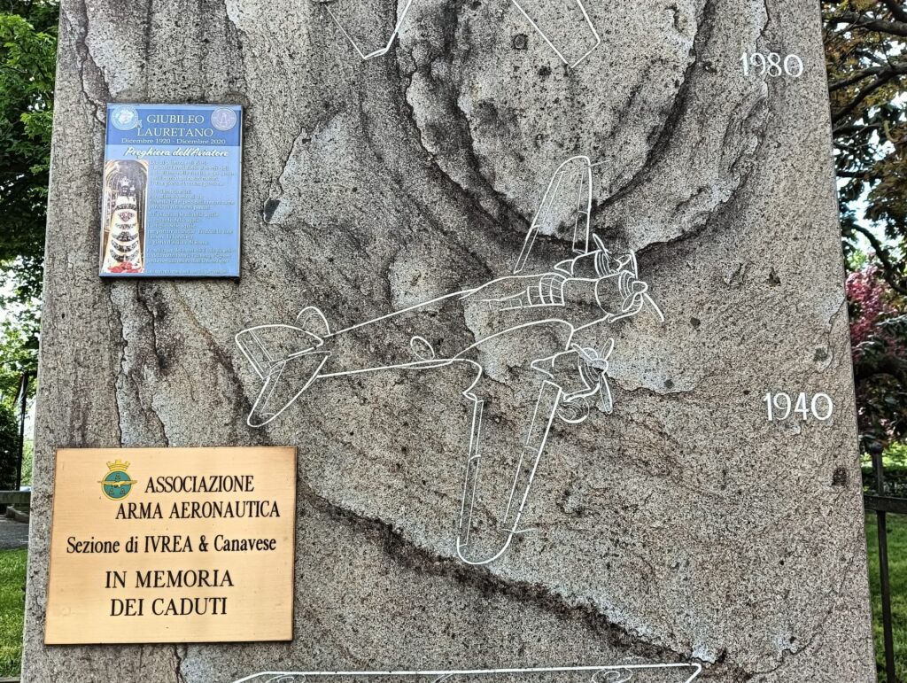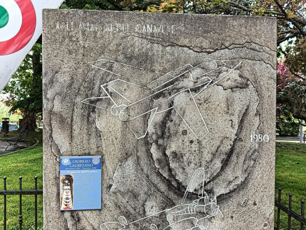 Sul cippo agli Aviatori Canavesani, c'è un cartellino azzurro legato ad un evento dell'anno 2020, Giubileo Lauretano. Riporta la preghiera dell'Aviatore.