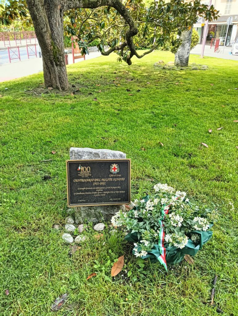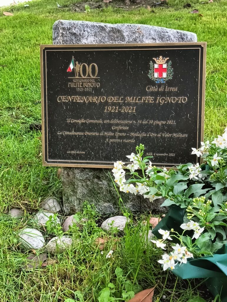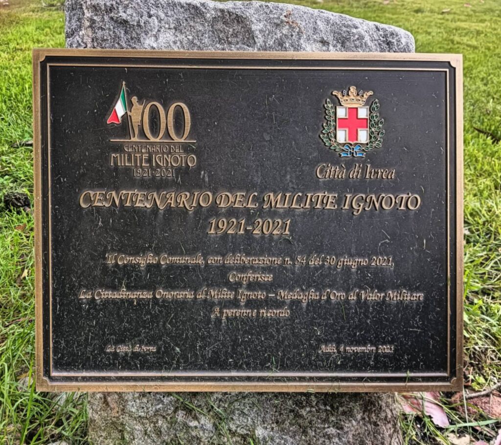 Il 4 Novembre del 1921, in occasione del centenario del Milite Ignoto, la Municipalità di Ivrea ha deliberato la di Lui concessione della Cittadinanza Onoraria. Contestualmente, ha posto nel Parco della Rimembranza un cippo con una targa dedicatoria, targa in ottone con fondo nero. Sulla targa compaiono il logo della celebrazione (un militare con bandiera seguito da 00 a formare il numero 100) con la scritta “Centenario del MILITE IGNOTO – 1921-2021. Inoltre, lo stemma della città di Ivrea con la scritta “Città di Ivrea”.