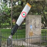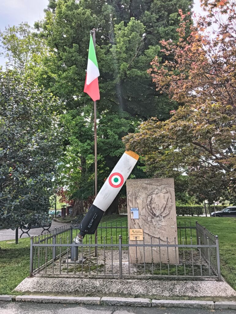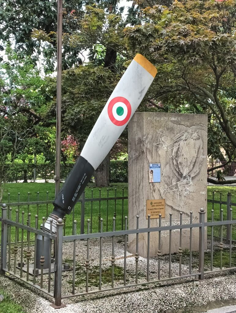 Questo monumento dedicato ai Caduti dell’Aviazione è una lastra rettangolare in travertino disposta verticalmente su cui sono incisi modelli di aerei militari di varie epoche con il rispettivo anno di costruzione: il biplano del 1915, il monoplano monomotore del 1940, fino al caccia a reazione del 1980.