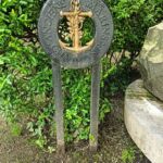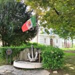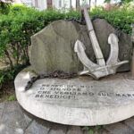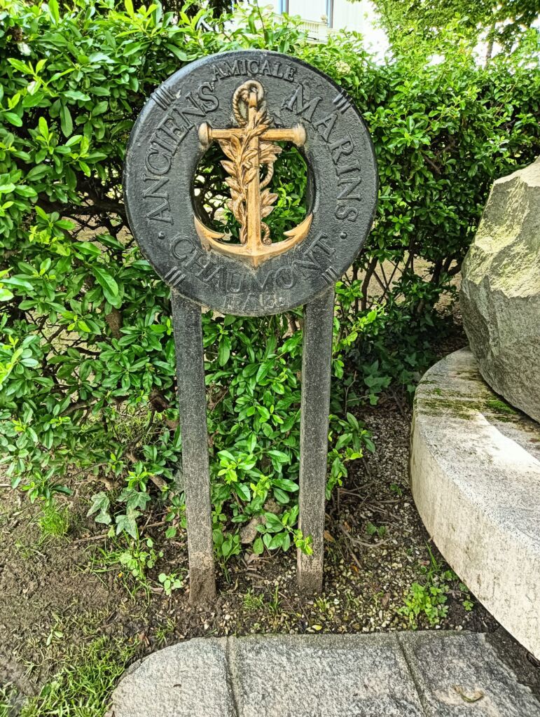 associazione francese AMICALE DES ANCIENS MARINS CHAUMONT FRANCE (scritto nello spessore della ruota). Nel cerchio un’ancora dorata con ramo di ulivo. Dietro al monumento c’è un’asta portabandiera