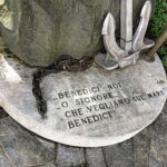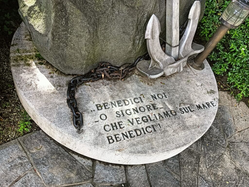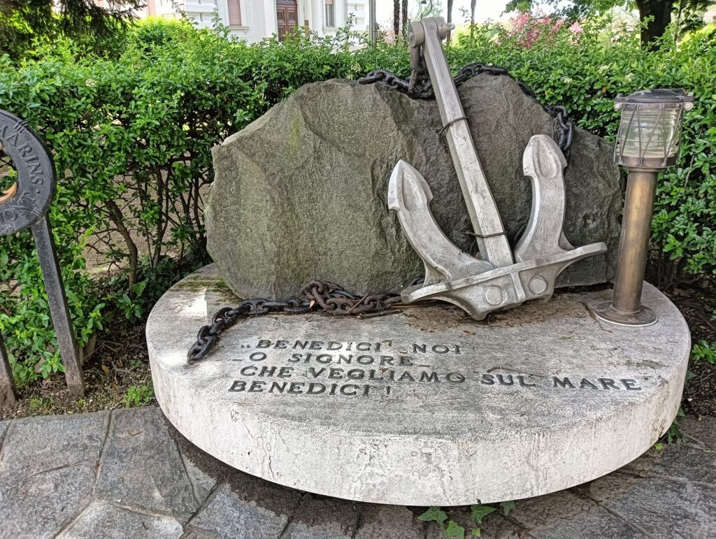 Su questa pietra basale, si svolge il monumento: una roccia irregolare, di colore verdastro, lunga all’incirca quanto il basamento, sulla quale poggia una grande ancora in metallo argenteo da cui parte con un giunto la catena di ferro posata irregolarmente sulla roccia. Sulla stessa base è stata posta una “luce di navigazione”, lampada verticale in ottone e vetro. Sulla sinistra, staccato dal resto del monumento, su sostegno metallico è posizionato lo stemma, a forma di ruota, dell’