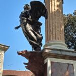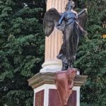 Sul fronte del piedistallo c’è un rostro a testa di lupo in porfido rosso che regge una statua in bronzo fuso della Vittoria alata, una figura di donna rappresentata in volo, con ali spiegate e corpo proteso in avanti, come se stesse annunciando la vittoria.