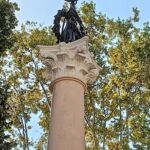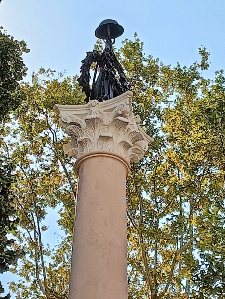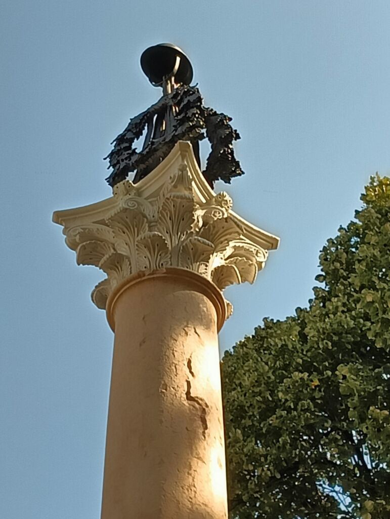 La cima è sormontata da un trofeo in bronzo fuso composto da tre armi incrociate sormontate da un elmetto, con due corone di alloro. Il fusto della colonna, a circa un terzo di altezza dalla base, è avvolto da una ghirlanda di bronzo.