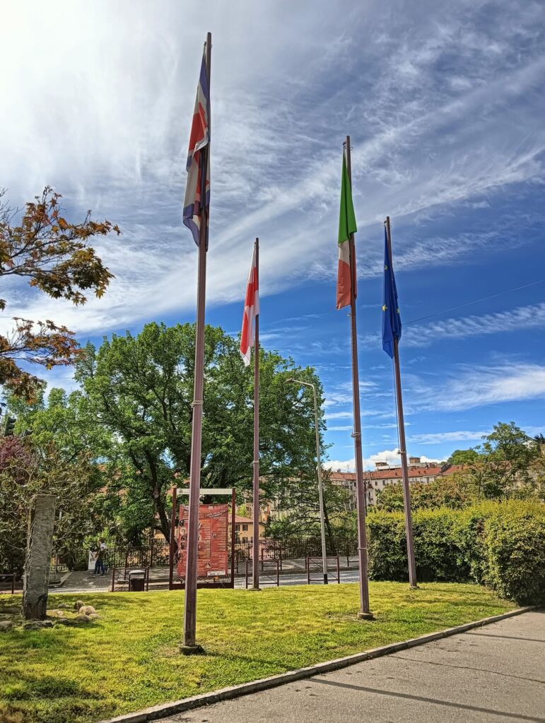 A limitare il Parco, ci sono quattro aste portabandiera con issate le bandiere di Europa, Italia, Piemonte ed Ivrea.