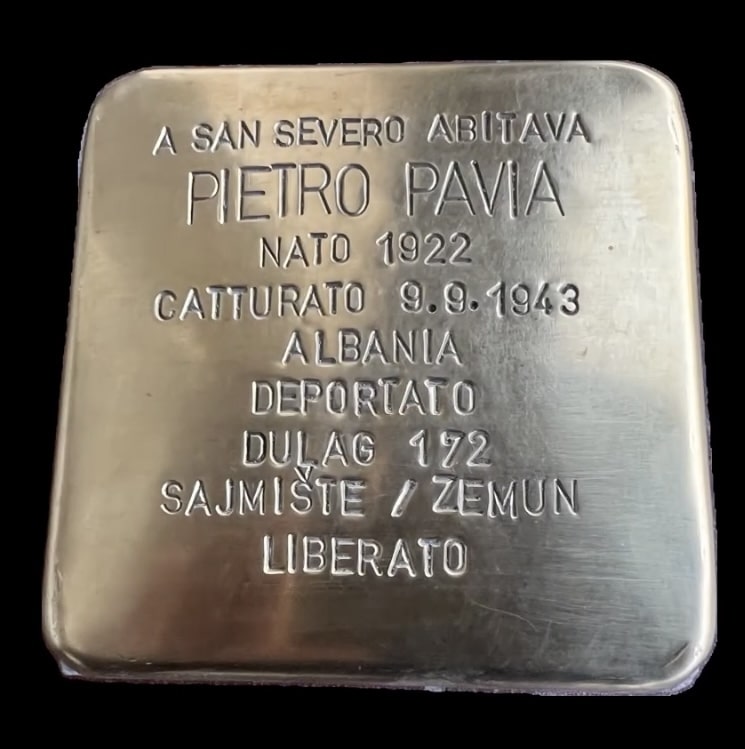 Pietro Pavia nasce a San Severo (FG) il 21 Maggio 1922 e ivi deceduto il 1° febbraio 1989. Durante la seconda guerra mondiale Pietro Pavia, in servizio nell'Arma dei Carabinieri Reali, viene mobilitato e distaccato in Albania dove partecipò alle attività belliche. Dopo l'8 settembre 1943 venne fatto prigioniero dai tedeschi e deportato nei campi di concentramento di Drascovizza (Albania) e di Sajmište (vicino Belgrado, nella Serbia occupata). Evaso dal Dulag 172, si unì alla 14^ Brigata Erzegovina Slava con la promessa, non mantenuta, di essere inviato in una unità italiana. Dopo una seconda avventurosa fuga raggiunse finalmente la 2^ Brigata Partigiana Italiana della Divisione "Garibaldi" ove divenne "Fante". Partecipò attivamente a tutte le azioni di guerra del suo Reparto. Nel Marzo del 1945, dopo 35 mesi di permanenza nei Balcani venne finalmente rimpatriato in Italia.