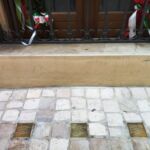 - Cubetto di porfido ricoperto sulla faccia superiore da una piastra di ottone su cui è incisa la dedica.