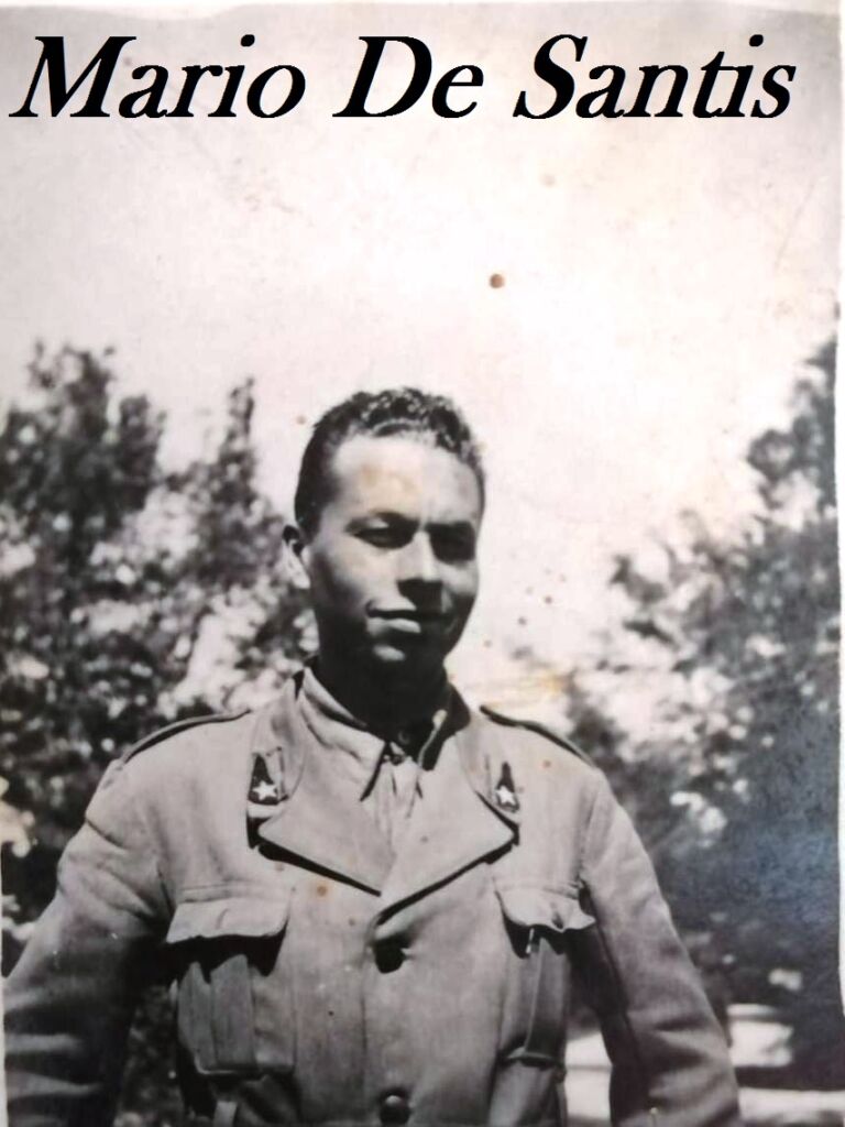 MARIO DE SANTIS nacque a Giulianova l’8 gennaio 1921 da Umberto e Addolorata Ortenzi. Durante la seconda guerra mondiale fu chiamato alle armi il 20 gennaio 1942 nel deposito del 48° reggimento Artiglieria a Nola ed inquadrato nel 14° reggimento artiglieria “Ferrara”. Partì da Bari il 6 luglio 1942 per sbarcare a Cattaro in Montenegro. Fu catturato dai tedeschi a Cettigne in Montenegro l’8 settembre 1943 e internato a Dresda nei lager del IV distretto con numero di matricola 53040. Durante la prigionia lavorò come operaio alle presse per una fabbrica di aerei da guerra. Fu liberato dagli alleati l’8 maggio 1945 e trattenuto fino al 24 luglio 1945. Morì a Giulianova il 4 febbraio 2011.