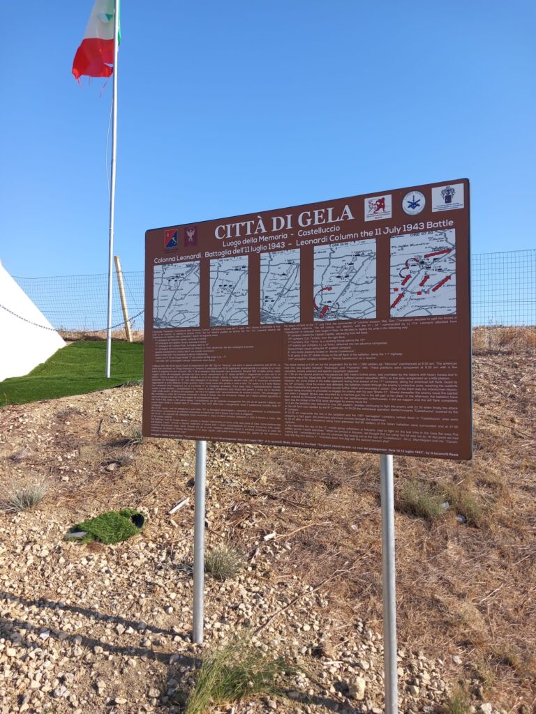 Il monumento consiste in una piramide bianca, sormontata da una croce, su cui è apposta la lastra dedicatoria relativa alla battaglia di Gela del luglio 1943. Visibile la scritta pax.