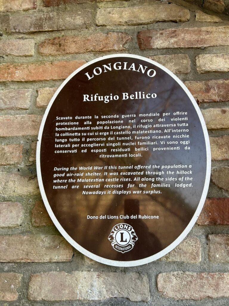 Scavato durante la seconda guerra mondiale per offrire protezione alla popolazione nel corso dei violenti bombardamenti subiti da Longiano, il rifugio attraversa tutta la collinetta su cui si erge il castello malatestiano. All’interno, lungo tutto il percorso del tunnel, furono ricavate nicchie laterali per accogliervi singoli nuclei familiari. Vi sono oggi conservati ed esposti residui bellici provenienti da ritrovamenti locali.