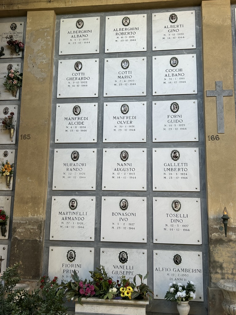 - Le arcate accolgono le tombe di partigiani che hanno operato sul territorio di San Giovanni in Persiceto. Non è stato possibile reperire informazioni sulle circostanze e l'epoca in cui il il Sacrario è stato adibito. Numerosi dei partigiani presenti, come indicato dalla data obituaria, sono caduti in seguito al rastrellamento di Amola di Piano e fucilati a Sabbiuno di Paderno (14 e 23 dicembre 1944). Sono presenti due donne partigiane. Non è stato possibile accertare perché sia presente almeno una tomba non riconducibile alla guerra di Liberazione.