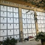 - Le arcate sono intervallate da colonne intonacate su cui sono apposte due croci latine, simbolo religioso della crocifissione di Cristo, sotto le quali sono apposte due torce con ila lampada in forma di fiamma, simbolo della vita che arde. Anche l'iscrizione in alto è da considerare simbolica, in quanto “Libertà va cercando, ch’è sì cara” è un celebre verso di Dante Alighieri, tratto dal I canto del Purgatorio nella Divina Commedia. Dante parla della libertà come valore fondamentale dell’essere umano, qualcosa per cui vale la pena impegnarsi e anche soffrire.