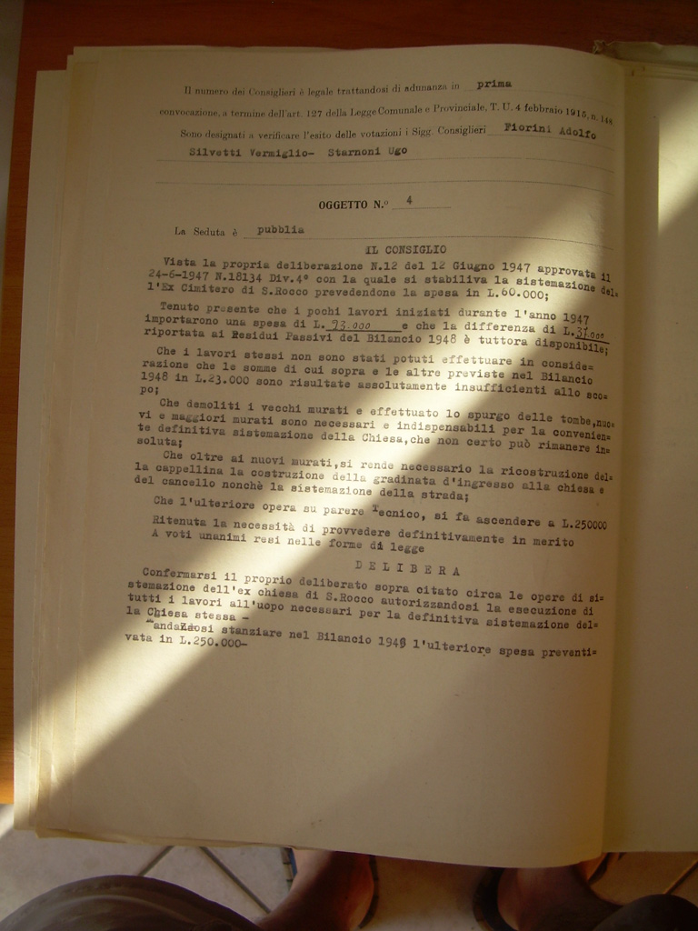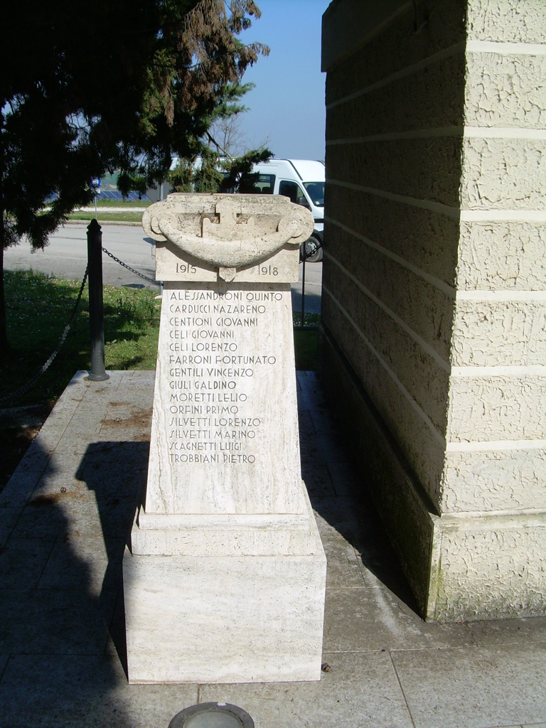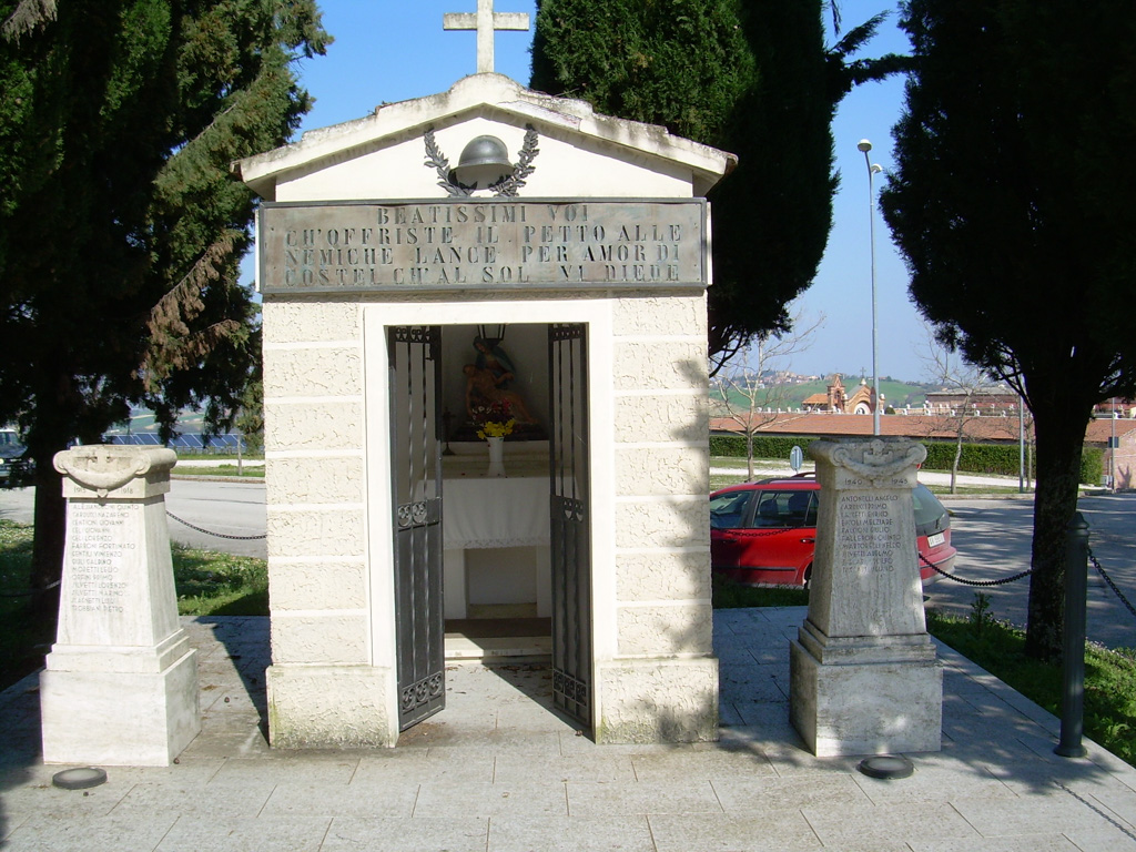 - Il sacrario ai Caduti deriva dalla trasformazione della piccolissima Chiesa di San Rocco, di patronato del Comune, posta come tutti i San Rocco in un incrocio prima del paese. Abbiamo trovato solo la delibera del Consiglio e non sappiamo se c'è un atto più ufficiale che lo classifichi come sacrario ai Caduti.