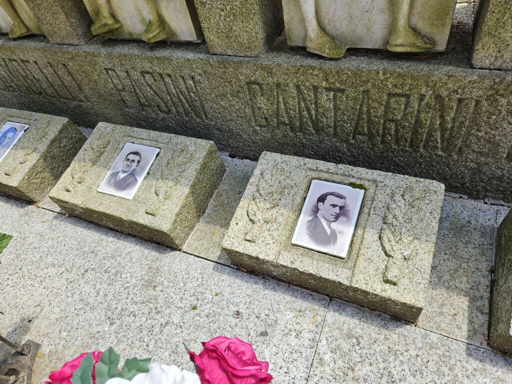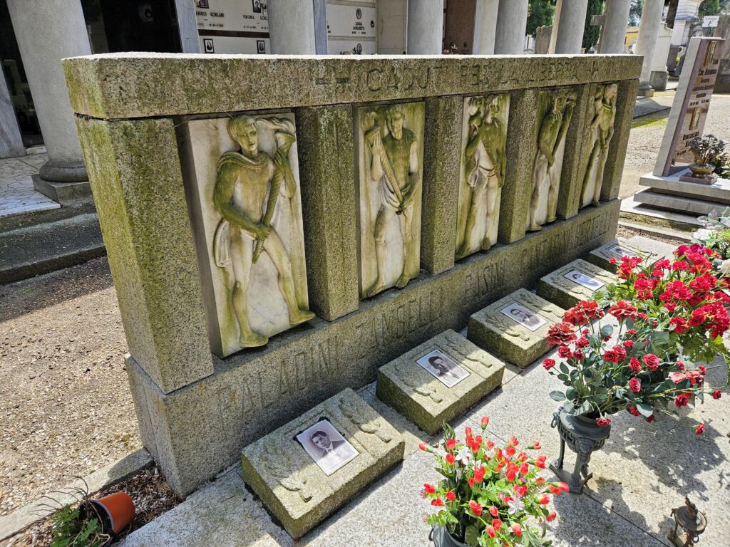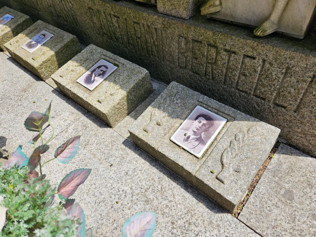 Sotto ognuna di esse è inciso nella pietra il solo cognome del Caduto. A ciascun margine anteriore della superficie sepolcrale, si trovano due grandi ed elaborate lampade votive di bronzo, con la fiamma scolpita. Al centro di ogni tomba si trova un vaso portafiori di bronzo realizzato allo stesso modo delle due lampade votive, ma più piccolo per dimensioni. Ai piedi di ogni sepoltura, disposti centralmente, vi sono altrettante piccole lampade votive in bronzo, sempre della stessa foggia di quelle più grandi.